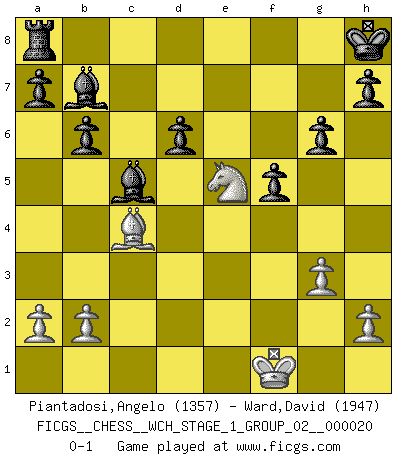 Last move : 0-1 2018 December 27 18:43:44 [Event "FICGS__CHESS__WCH_STAGE_1_GROUP_02__000020"] [Site "FICGS"] [Date "2018.11.01"] [Round "1"] [White "Piantadosi,Angelo"] [Black "Ward,David"] [Result "0-1"] [WhiteElo "1357"] [BlackElo "1947"] 1.d4 Nf6 2.c4 g6 3.Nc3 Bg7 4.e4 d6 5.Nf3 O-O 6.Be2 Nbd7 7.O-O e5 8.dxe5 dxe5 9.Bg5 Nc5 10.Qxd8 Rxd8 11.Rad1 Re8 12.Nd5 Nxd5 13.cxd5 Nxe4 14.Nd2 Nxg5 15.f3 f5 16.Bc4 Kh8 17.Nb3 e4 18.fxe4 Nxe4 19.Nd2 Bd4+ 20.Kh1 Nf2+ 21.Rxf2 Bxf2 22.g3 Re1+ 23.Rxe1 Bxe1 24.Nf3 Bf2 25.Kg2 Bc5 26.Ne5 b6 27.d6 Bb7+ 28.Kf1 cxd6 0-1 King's Indian : 6.Be2 Kingside Castling by player Black (move 5) Kingside Castling by player White (move 7) Player Black won this chess game. Follow this game move after move (download)A strong memory, concentration, imagination, and a strong will is required to become a great Chess player. (Bobby Fischer) Sie bekommen vielleicht den Eindruck, dass die Spitzenspieler überhaupt gar nicht so stark sind. Aber das stimmt nicht. Es ist eine Illusion. Mit einem Computer an der Seite ist es sehr leicht, Urteile zu fällen, aber wenn man alleine am Brett sitzt, sieht die Sache ganz anders aus. (Vladimir Kramnik) Después de una mala apertura, hay una esperanza en el juego medio. Pero una vez que estas en finales, el momento de la verdad ha llegado. (Edmar Mednis) Les erreurs sont comme les malheurs, elles n'arrivent jamais seules. (Siegbert Tarrasch) Methinks King Thibault should dub Marius Zubac a knight of the square board... I mean table, henceforth addressing him as Sir Marius, and bestow on him a suitable land from the kingdom of FICGS & marry him off to a worthy, fair maiden, lest he slice our heads with his mighty sword in his wrath. (Dinesh De Silva)