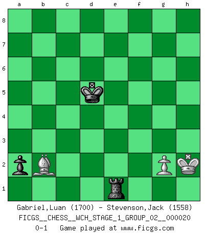 Last move : 0-1 2019 June 9 19:38:49 [Event "FICGS__CHESS__WCH_STAGE_1_GROUP_02__000020"] [Site "FICGS"] [Date "2018.11.01"] [Round "1"] [White "Gabriel,Luan"] [Black "Stevenson,Jack"] [Result "0-1"] [WhiteElo "1700"] [BlackElo "1558"] 1.e4 e5 2.Nf3 Nc6 3.Bb5 a6 4.Ba4 Nf6 5.O-O Nxe4 6.d4 b5 7.Bb3 d5 8.dxe5 Be6 9.Nbd2 Nc5 10.c3 d4 11.Bxe6 Nxe6 12.cxd4 Ncxd4 13.a4 Bb4 14.axb5 Nxb5 15.Qa4 Bxd2 16.Bxd2 O-O 17.Rfd1 c5 18.Be3 Qb6 19.h3 Nbc7 20.Rac1 Rad8 21.Rxd8 Rxd8 22.Qc2 Rb8 23.Bxc5 Qxb2 24.Qxb2 Rxb2 25.Bd6 Rb7 26.Nd2 h5 27.Nc4 h4 28.Kh2 g5 29.Ra1 Kg7 30.Ra4 Rb1 31.Ra2 Kg6 32.Ne3 Rb6 33.Rc2 Ne8 34.Ba3 a5 35.Ra2 a4 36.Nc4 Rc6 37.Na5 Ra6 38.Bb4 Nc5 39.Nc4 Nd3 40.Ba5 Ng7 41.Kg1 Nc5 42.Ra3 Nge6 43.Bd2 Nd4 44.Be3 Nc2 45.Bxc5 Nxa3 46.Nxa3 Rc6 47.Bd6 f6 48.Kf1 Kf5 49.Ke2 fxe5 50.Be7 Rc1 51.Kd2 Rc7 52.Bb4 g4 53.hxg4+ Kxg4 54.Nc2 Kf5 55.Kd3 Rg7 56.Ne3+ Ke6 57.Ke2 Rb7 58.Nc2 Rc7 59.Ne3 Rc1 60.Bd2 Rb1 61.Nc2 Rg1 62.Ne1 a3 63.f3 Kd5 64.Kf2 a2 65.Bc3 Rh1 66.Ke2 e4 67.fxe4+ Kxe4 68.Bg7 Kd5 69.Bh8 Rg1 70.Kf2 Rh1 71.Ke2 Kc4 72.Bg7 Kb3 73.Be5 Ka3 74.Bd4 Ka4 75.Bg7 Ka5 76.Bd4 Kb4 77.Bg7 Ka4 78.Bd4 Kb4 79.Bg7 Kc4 80.Bf6 Kc5 81.Bh8 Kc4 82.Bg7 Kb4 83.Bf6 Kc5 84.Bg7 Kd6 85.Bc3 Kc5 86.Bf6 Kc6 87.Bb2 h3 88.Kf2 h2 89.Kg3 Rxe1 90.Kxh2 Kd5 0-1 This chess game has been lost on time (started : 2018.11.01 15:27:29) Comment by player 1 : Luan Gabriel : Another 3 food repetition. Draw Ruy Lopez : Open, 7.Bb3 Kingside Castling by player White (move 5) Kingside Castling by player Black (move 16) 10 pieces endgame at move 53 : White KBNPP , Black KRPPP WHITE : King + 1 Bishop 1 Knight 2 Pawns BLACK : King + 1 Rook 3 Pawns 9 pieces endgame at move 67 : White KBNPP , Black KRPP WHITE : King + 1 Bishop 1 Knight 2 Pawns BLACK : King + 1 Rook 2 Pawns 8 pieces endgame at move 67 : White KBNP , Black KRPP WHITE : King + 1 Bishop 1 Knight 1 Pawn BLACK : King + 1 Rook 2 Pawns 7 pieces endgame at move 89 : White KBP , Black KRPP WHITE : King + 1 Bishop 1 Pawn BLACK : King + 1 Rook 2 Pawns 6 pieces endgame at move 90 : White KBP , Black KRP WHITE : King + 1 Bishop 1 Pawn BLACK : King + 1 Rook 1 Pawn Player Black won this chess game. Follow this game move after move (download)Excellence at Chess is one mark of a scheming mind. (Sir Arthur Conan Doyle) Frage des Reporters: -Worin besteht das Ziel von Gambiteröffnungen? Antwort: -Auf Kosten der Partie einen Ruf als Angriffspieler zu erwerben.- (Siegbert Tarrasch) Hay jugadores fuertes y personas amables y yo soy un jugador fuerte. (Bobby Fischer) Toutes les manuvres exécutées sur une colonne ouverte ont pour but ultime l'intrusion définitive sur la septième ou la huitième rangée, en plein cur de la position ennemie. (Aaron Nimzovitch) It's unlucky to be superstitious. (Dave Enteles)