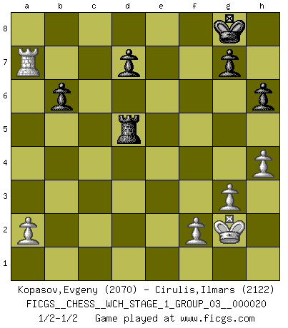 Last move : 1/2-1/2 2019 April 9 1:35:50 [Event "FICGS__CHESS__WCH_STAGE_1_GROUP_03__000020"] [Site "FICGS"] [Date "2018.11.01"] [Round "1"] [White "Kopasov,Evgeny"] [Black "Cirulis,Ilmars"] [Result "1/2-1/2"] [WhiteElo "2070"] [BlackElo "2122"] 1.d4 f5 2.Bf4 Nf6 3.e3 e6 4.Nf3 Be7 5.h3 O-O 6.Bd3 b6 7.O-O Bb7 8.c4 Ne4 9.Nfd2 Ng5 10.Nc3 Nc6 11.Rc1 Bf6 12.Re1 Ne7 13.b4 Ng6 14.Bg3 Be7 15.b5 Bb4 16.Qb3 Qe7 17.Rc2 f4 18.exf4 Nxf4 19.Bf1 Nh5 20.Nd5 Bxd5 21.cxd5 Nxg3 22.Qxg3 Bd6 23.Qe3 Rae8 24.dxe6 Kh8 25.Bc4 Qd8 26.Qd3 Nxe6 27.Bxe6 Qf6 28.Nc4 Rxe6 29.Rxe6 Qxe6 30.Nxd6 Qxd6 31.Qe4 Rc8 32.d5 h6 33.g3 Ra8 34.Qe2 Rf8 35.h4 Rf5 36.Rd2 Re5 37.Qc4 Re1+ 38.Kg2 Qe5 39.Qd4 Qxd4 40.Rxd4 Rb1 41.Rc4 Rxb5 42.Rxc7 Rxd5 43.Rxa7 Kg8 1/2-1/2 Dutch Kingside Castling by player Black (move 5) Kingside Castling by player White (move 7) This chess game ended in a draw. Follow this game move after move (download)It is the aim of the modern school, not to treat every position according to one general law, but according to the principle inherent in the position. (Richard Reti) Alles was ich jemals tun will ist Schach spielen. (Robert James Fischer) Te sientas frente a un tablero y repentinamente tu corazón brinca. Tu mano tiembla al tomar una pieza y moverla. Pero lo que el Ajedrez te enseña es que tu debes permanecer ahí con calma y pensar de que si realmente es una buena idea o de que si hay otras ideas mejores. (Stanley Kubrick) L'ordinateur a tué l'originalité. Il n'y a plus guère d'aventures sur l'échiquier. (Jacob Murray) The ultimate in disposing one's troops is to be without ascertainable shape. Then the most penetrating spies cannot pry in nor can the wise lay plans against you. (Sun Tzu)