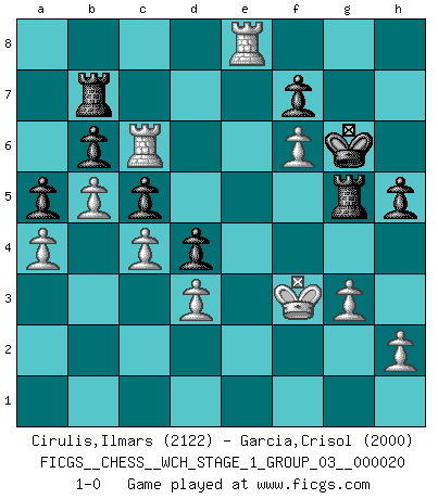 Last move : 1-0 2019 April 5 15:39:4 [Event "FICGS__CHESS__WCH_STAGE_1_GROUP_03__000020"] [Site "FICGS"] [Date "2018.11.01"] [Round "1"] [White "Cirulis,Ilmars"] [Black "Garcia,Crisol"] [Result "1-0"] [WhiteElo "2122"] [BlackElo "2000"] 1.c4 e5 2.Nc3 Nf6 3.Nf3 Nc6 4.e4 Bb4 5.d3 d6 6.a3 Bc5 7.b4 Bb6 8.Na4 Bd4 9.Nxd4 Nxd4 10.Nc3 a5 11.b5 O-O 12.Ne2 c5 13.Nxd4 cxd4 14.f4 Nd7 15.f5 Qh4+ 16.g3 Qd8 17.a4 Nc5 18.Ra2 g6 19.Rf2 gxf5 20.exf5 Kh8 21.Bg2 Ra7 22.f6 Rg8 23.Ba3 Bg4 24.Qc2 b6 25.Bxc5 dxc5 26.Qd2 Bh5 27.O-O Bg6 28.Re1 Qd6 29.Qe2 Rd7 30.Be4 R7d8 31.Bxg6 Rxg6 32.Qxe5 Qxe5 33.Rxe5 h6 34.Re7 Kg8 35.Kg2 Rd6 36.Re8+ Kh7 37.Rf8 Rd7 38.Rc8 Rg5 39.Re2 Kg6 40.Rc6 Rb7 41.Re8 h5 42.Kf3 1-0 English Opening Kingside Castling by player Black (move 11) Kingside Castling by player White (move 27) Player White won this chess game. Follow this game move after move (download)I play correspondence chess because it is both art and science while chess is art only. (A player at FICGS) Es hat in meinem Leben Zeiten gegeben, da ich sehr nahe daran war zu glauben, daß ich auch nicht eine einzige Schachpartie verlieren könnte. (José Raúl Capablanca) Mis oponentes también hacen buenas movidas. A veces yo no tomo esas cosas en consideración. (Bobby Fischer) Il vaut toujours mieux jouer un plan faux de façon logique que de n'avoir pas de plan du tout. (Victor Kortchnoï) The absolute truth is the thing that makes people laugh. (Carl Reiner)