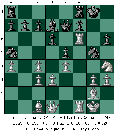Last move : 1-0 2019 February 18 11:55:13 [Event "FICGS__CHESS__WCH_STAGE_1_GROUP_03__000020"] [Site "FICGS"] [Date "2018.11.01"] [Round "1"] [White "Cirulis,Ilmars"] [Black "Lipsits,Sasha"] [Result "1-0"] [WhiteElo "2122"] [BlackElo "1824"] 1.c4 e5 2.Nc3 Nf6 3.Nf3 Nc6 4.e4 Bb4 5.d3 d6 6.a3 Bxc3+ 7.bxc3 Qe7 8.g3 h6 9.Bg2 O-O 10.h3 Bd7 11.O-O Rfb8 12.a4 Na5 13.Ra2 Qd8 14.Nh4 Qe7 15.f4 Rf8 16.Raf2 Nh7 17.f5 Ng5 18.f6 gxf6 19.Rxf6 1-0 English Opening Kingside Castling by player Black (move 9) Kingside Castling by player White (move 11) Player White won this chess game. Follow this game move after move (download)I have never in my life played the French Defence, which is the dullest of all openings. (Wilhelm Steinitz) Jeder leidlich begabte Spieler, er braucht keineswegs hervorragend veranlagt zu sein, kann es zum Meister bringen. Aber das ist ja auch gar nicht nötig! Der richtige Standpunkt ist es, zu seinem Vergnügen zu spielen, und man glaube ja nicht, dass der Genuss proportional dem Können sei. (Siegbert Tarrasch) Si yo gano un torneo, yo lo gano por mí mismo. Yo hago las jugadas. Nadie me ayuda. (Bobby Fischer) On entre au jeu d'Echecs comme on entre en Religion. Pour le joueur d'Echecs, la partie d'Echecs c'est l'office, la messe, le défilé du 1er Mai, le dépôt de gerbe au Monument aux Morts. C'est un drame sacré. (Michel Roos) If we knew what we were doing, we would not call it research. (Albert Einstein)