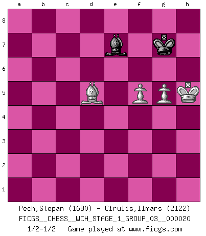 Last move : 1/2-1/2 2019 May 9 14:4:26 [Event "FICGS__CHESS__WCH_STAGE_1_GROUP_03__000020"] [Site "FICGS"] [Date "2018.11.01"] [Round "1"] [White "Pech,Stepan"] [Black "Cirulis,Ilmars"] [Result "1/2-1/2"] [WhiteElo "1680"] [BlackElo "2122"] 1.e4 c5 2.Nf3 d6 3.d4 cxd4 4.Nxd4 Nf6 5.Nc3 a6 6.Be3 e5 7.Nb3 Be7 8.Be2 Be6 9.O-O O-O 10.Qd2 Nbd7 11.a4 Rc8 12.a5 Rxc3 13.Qxc3 Nxe4 14.Qb4 Bd5 15.Bf3 Ndf6 16.Rfd1 Bc6 17.c4 d5 18.Qe1 d4 19.Bxd4 exd4 20.Nxd4 Qc7 21.Nxc6 Qxc6 22.Rd4 Bc5 23.Rxe4 Nxe4 24.Qxe4 Qxe4 25.Bxe4 Rb8 26.Rd1 Kf8 27.Rd5 Be7 28.c5 Bf6 29.Rd7 Bxb2 30.Bxb7 Ke8 31.c6 Rd8 32.Rxd8+ Kxd8 33.Bxa6 Bc3 34.Bc4 Bxa5 35.Bxf7 Ke7 36.Bd5 h6 37.g3 Kd6 38.Be4 Ke5 39.f3 g5 40.Kg2 h5 41.Bg6 Kd5 42.Bxh5 Kxc6 43.Kh3 Kd7 44.Kg4 Bd2 45.h4 gxh4 46.Kxh4 Bh6 47.f4 Ke7 48.Be2 Kf6 49.Bd3 Kf7 50.Kh5 Bg7 51.g4 Bf8 52.g5 Kg7 53.f5 Be7 54.Kg4 Kf7 55.Bc4+ Kg7 56.Bd5 Bd8 57.Kh5 Be7 1/2-1/2 Sicilian : Najdorf, Byrne (English) attack Kingside Castling by player White (move 9) Kingside Castling by player Black (move 9) 10 pieces endgame at move 35 : White KBPPPP , Black KBPP WHITE : King + 1 Bishop 4 Pawns BLACK : King + 1 Bishop 2 Pawns 9 pieces endgame at move 42 : White KBPPPP , Black KBP WHITE : King + 1 Bishop 4 Pawns BLACK : King + 1 Bishop 1 Pawn 8 pieces endgame at move 42 : White KBPPP , Black KBP WHITE : King + 1 Bishop 3 Pawns BLACK : King + 1 Bishop 1 Pawn 7 pieces endgame at move 45 : White KBPP , Black KBP WHITE : King + 1 Bishop 2 Pawns BLACK : King + 1 Bishop 1 Pawn 6 pieces endgame at move 46 : White KBPP , Black KB WHITE : King + 1 Bishop 2 Pawns BLACK : King + 1 Bishop This chess game ended in a draw. Follow this game move after move (download)When your house is on fire, you can't be bothered with the neighbors. Or, as we say in Chess, if your King is under attack you don't worry about losing a Pawn on the Queen's side. (Gary Kasparov) Fischer ist das größte Genie, das je vom Schachhimmel heruntergestiegen ist. (Mikhail Nekhemyevich Tal) El Peón aislado arroja penumbra sobre todo el tablero. (Aaron Nimzovich) Je crois qu'il existe des manières très spécifiques de jouer efficacement contre une machine. Evidemment, nous n'avons aucune chance en technique pure, parce que l'ordinateur calcule de manière parfaite. Mais lorsque nous faisons appel à notre cerveau, en utilisant l'intuition et la compréhension, alors nous restons beaucoup plus forts. (Anatoli Karpov) For peace of mind, resign as general manager of the universe. (Douglas Adams)