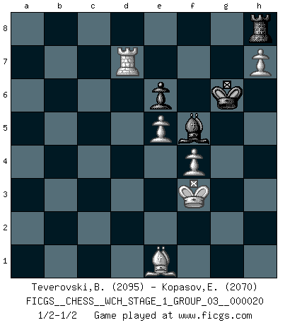 Last move : 1/2-1/2 2019 January 23 10:25:56 [Event "FICGS__CHESS__WCH_STAGE_1_GROUP_03__000020"] [Site "FICGS"] [Date "2018.11.01"] [Round "1"] [White "Teverovski,Bogoljub"] [Black "Kopasov,Evgeny"] [Result "1/2-1/2"] [WhiteElo "2095"] [BlackElo "2070"] 1.e4 e6 2.d4 d5 3.Nc3 Bb4 4.e5 Ne7 5.a3 Bxc3+ 6.bxc3 c5 7.Qg4 cxd4 8.Qxg7 Rg8 9.Qxh7 Qc7 10.Ne2 Nbc6 11.f4 Bd7 12.Qd3 dxc3 13.Qxc3 Nf5 14.Rb1 d4 15.Qc4 Qa5+ 16.Bd2 Qxa3 17.Rxb7 Ne3 18.Qd3 Qxd3 19.cxd3 Nxg2+ 20.Bxg2 Rxg2 21.h4 Bc8 22.Rb1 a5 23.h5 Kf8 24.Kf1 Rg4 25.Kf2 Ba6 26.Rb6 Ne7 27.Nxd4 Bxd3 28.Kf3 Rg8 29.h6 Rg6 30.Rd6 Kg8 31.Rd7 Nf5 32.Nxf5 Bxf5 33.h7+ Kg7 34.Bxa5 Rh6 35.Rxh6 Kxh6 36.Rxf7 Kg6 37.Rd7 Rh8 38.Be1 1/2-1/2 French : Winawer, Advance variation 10 pieces endgame at move 36 : White KRBPPP , Black KRBP WHITE : King + 1 Rook 1 Bishop 3 Pawns BLACK : King + 1 Rook 1 Bishop 1 Pawn This chess game ended in a draw. Follow this game move after move (download)Without error there can be no brilliancy. (Emanuel Lasker) Ich hatte Angst gegen einen russischen Großmeister zu verlieren, und er befürchtete gegen einen kleinen Jungen zu verlieren. (über ein Remis gegen Juri Awerbach). (Robert James Fischer) Puntos débiles o agujeros en la posición de tu oponente deben de ser ocupados por piezas, no Peones. (Siegbert Tarrasch) Si le désir cupide (et stupide) de gagner est une inépuisable source de souffrance, une combinaison brillante sur l'échiquier est une découverte : le coquelicot qui s'épanouit lorsque apparaît la Voie Lactée. (Arrabal) The faster the computer, the slower the brain. (Thibault de Vassal)