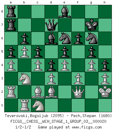 Last move : 1/2-1/2 2019 July 18 13:1:32 [Event "FICGS__CHESS__WCH_STAGE_1_GROUP_03__000020"] [Site "FICGS"] [Date "2018.11.01"] [Round "1"] [White "Teverovski,Bogoljub"] [Black "Pech,Stepan"] [Result "1/2-1/2"] [WhiteElo "2095"] [BlackElo "1680"] 1.c4 e5 2.a3 Nf6 3.Qc2 c6 4.d3 d5 5.Nf3 Bd6 6.e4 d4 7.Nbd2 c5 8.b4 Nc6 9.b5 Ne7 10.a4 a6 11.g3 O-O 12.Bg2 h6 13.O-O Bd7 14.Ba3 b6 15.Nh4 Ra7 16.Kh1 Qc7 17.Bb2 a5 18.Rg1 g5 19.Nhf3 Ng6 20.Bc1 Kg7 21.Ne1 Rh8 22.Nb3 Be7 23.h3 Qc8 24.Kh2 h5 25.Rf1 Ne8 26.Bb2 h4 27.g4 f6 28.Bc1 Nc7 29.Bd2 Ne6 30.Nc1 Be8 31.Qd1 Qd7 32.Nf3 Ngf4 33.Rh1 Bf7 34.Ng1 Re8 35.Qb3 Bf8 36.Bf1 Ng6 37.Kg2 Nh8 38.Rh2 Kg8 39.Kh1 Bg7 40.Qd1 Kf8 41.Nb3 Ng6 42.Bc1 Ke7 43.Qe1 Kd8 44.f3 Kc7 45.Rb2 Kc8 46.Bd2 Qd8 47.Ne2 Ra8 48.Nec1 Re7 49.Kh2 Ngf4 50.Be2 Rea7 51.Qf2 Rb7 52.Rab1 Kd7 53.Bd1 Ng6 54.Bc2 Ke8 55.Qe1 Rba7 56.Ra1 Bf8 57.Qd1 Qd7 58.Ne2 Bd6 59.Kh1 Kf8 60.Qe1 Kg7 61.Ng1 Qc8 62.Rd1 Ngf4 63.Bb1 Be8 64.Kh2 Ng6 65.Ne2 Kg8 66.Bc2 Bf7 67.Rdb1 Qd7 68.Nec1 Be8 69.Qf2 Kg7 70.Ra2 1/2-1/2 English Opening Kingside Castling by player Black (move 11) Kingside Castling by player White (move 13) This chess game ended in a draw. Follow this game move after move (download)When your house is on fire, you can't be bothered with the neighbors. Or, as we say in Chess, if your King is under attack you don't worry about losing a Pawn on the Queen's side. (Gary Kasparov) Ich kenne keine einzige Person, die behaupten würde, Garri Kasparow sei ein guter Mensch (Nigel Short) La captura del Rey enemigo es la finalidad pero no el primer objetivo de la partida. (William Steinitz) Le jeu d'échecs est comme rejeté hors du temps. (Antoine de Saint-Exupéry) If you know the enemy and know yourself you need not fear the results of a hundred battles. (Sun Tzu)