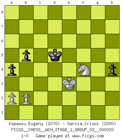 Last move : 1-0 2019 April 5 15:39:11 [Event "FICGS__CHESS__WCH_STAGE_1_GROUP_03__000020"] [Site "FICGS"] [Date "2018.11.01"] [Round "1"] [White "Kopasov,Evgeny"] [Black "Garcia,Crisol"] [Result "1-0"] [WhiteElo "2070"] [BlackElo "2000"] 1.d4 Nf6 2.c4 e6 3.Nf3 b6 4.g3 Ba6 5.Qc2 c5 6.d5 exd5 7.cxd5 Bb7 8.Bg2 Nxd5 9.O-O Nc6 10.Rd1 Be7 11.Qa4 Nf6 12.Nh4 Qc8 13.Nf5 Kf8 14.e4 Nd4 15.Nxe7 Kxe7 16.Nc3 Qc6 17.Qc4 Kf8 18.Bf4 h5 19.h4 Re8 20.Rxd4 cxd4 21.Qxd4 Kg8 22.Rd1 d6 23.f3 Nd7 24.Bf1 Ne5 25.Kf2 Qc8 26.Qxd6 Ng6 27.Bb5 Re6 28.Qd4 Nxf4 29.gxf4 Qb8 30.Ke3 Re7 31.f5 f6 32.Qd6 Qxd6 33.Rxd6 Kh7 34.Ne2 a6 35.Bc4 b5 36.Be6 Rc7 37.Nf4 Kh6 38.Ng6 Ra8 39.e5 a5 40.Bd7 Bc8 41.Bxc8 Raxc8 42.Nf4 Rc6 43.Rxc6 Rxc6 44.e6 g5 45.hxg5+ fxg5 46.Nd3 Kg7 47.Ne5 Rc8 48.f4 Kf6 49.Ke4 gxf4 50.Nd7+ Kg5 51.f6 f3 52.Kxf3 Kf5 53.f7 Kxe6 54.f8Q Rxf8+ 55.Nxf8+ Kf7 56.Nd7 Ke6 57.Nc5+ Kd5 58.Nd3 h4 59.Ke3 a4 60.Nf4+ 1-0 Queen's Indian : Nimzovich variation (exaggerated Fianchetto) Kingside Castling by player White (move 9) 10 pieces endgame at move 53 : White KNPPP , Black KRPPP WHITE : King + 1 Knight 3 Pawns BLACK : King + 1 Rook 3 Pawns Promotion Queen by player White (move 54) 9 pieces endgame at move 54 : White KNPP , Black KRPPP WHITE : King + 1 Knight 2 Pawns BLACK : King + 1 Rook 3 Pawns 8 pieces endgame at move 55 : White KNPP , Black KPPP WHITE : King + 1 Knight 2 Pawns BLACK : King + 3 Pawns Player White won this chess game. Follow this game move after move (download)For me, Chess is life and every game is like a new life. Every Chess player gets to live many lives in one lifetime. (Eduard Gufeld) Wer mein Gambit spielt, muß bereit sein, alle Brücken hinter sich abzubrechen. Es verändert den ganzen Menschen. Es wirkt wie ein Zauberstab und fördert verkümmerte, gute Charakter- eigenschaften wieder zu Tage. (Emil Joseph Diemer) Realmente no sabemos como el juego fue inventado, aunque hay sospechas. Tan pronto como descubramos a los culpables, se los haremos saber. (Bruce Pandolfini) Aux échecs, les retours au sommet sont rares : les dommages psychologiques consécutifs à une défaite sont trop sévères. (Daily Telegraph) Live, lose, and learn, by observing your opponent how to win. (Amber Steenbock)