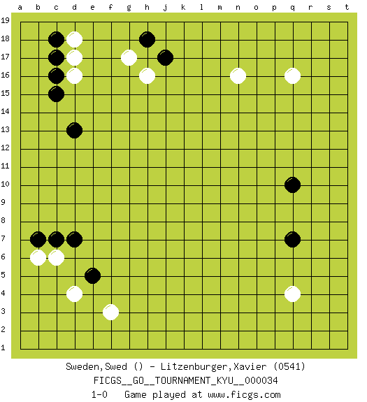 Last move : 1-0 2007 July 10 10:33:52 [Event "FICGS__GO__TOURNAMENT_KYU__000034 "] [Site "FICGS"] [Date "2007.05.23"] [Round "1"] [Black "Sweden,Swed "] [White "Litzenburger,Xavier "] [Result "1-0"] [Rating 2 "0541"] 1.e5 q16 2.q10 d16 3.d13 q4 4.c17 d17 5.c18 d18 6.c16 h16 7.c15 d4 8.d7 f3 9.q7 c6 10.b7 b6 11.c7 n16 12.h18 g17 13.j17 1-0 This go game has been lost on time (started : 2007.05.23 16:29:36) Here are the names of the openings (joseki) played in the four corners : Corner d16 : d16 d13Hoshi (Hwajeom, Seongjeom, Xingwei`) 4-4 Point. The star or hoshi (4-4) point, emphasizing influence at the potential expense of territory.Nikken Takagakari (Dukan Nop'dakeolch'im, E`r Gaojia, 2-Space High Approach). Black 2 is a light approach move. Rarely played in even games, Black 2 is typically employed in handicap games. White continues with 6-4 or 3-10. In Korean Sunjang Baduk White has a stone on 8-4. Corner d4 : e5 d4Go-no-go (Wu~wu~) 5-5 Point. The 5-5 was experimented with briefly during the "New Fuseki" movement in Japan in the 1930s. The 5-5 point has not retained popularity because the 4-4 hoshi (star) point strikes a better balance between influence and territory. As one can see from the variations, though, the 5-5 is playable. Corner q4 : q4 q7Hoshi (Hwajeom, Seongjeom, Xingwei`) 4-4 Point. The star or hoshi (4-4) point, emphasizing influence at the potential expense of territory.Nikken Takagakari (Dukan Nop'dakeolch'im, E`r Gaojia, 2-Space High Approach). Black 2 is a light approach move. Rarely played in even games, Black 2 is typically employed in handicap games. White continues with 6-4 or 3-10. In Korean Sunjang Baduk White has a stone on 8-4. Player Black won this Go (weiqi, baduk) game.Follow this game move after move (download ) Capture what you cut off. (Anonymous) I feel so... helpless. (C-3PO in Star Wars ep.3)