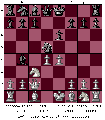 Last move : 1-0 2018 December 11 1:2:55 [Event "FICGS__CHESS__WCH_STAGE_1_GROUP_03__000020"] [Site "FICGS"] [Date "2018.11.01"] [Round "1"] [White "Kopasov,Evgeny"] [Black "Cafiero,Florian"] [Result "1-0"] [WhiteElo "2070"] [BlackElo "1578"] 1.d4 Nf6 2.c4 e6 3.Nc3 Bb4 4.Qc2 d5 5.cxd5 Nxd5 6.e4 1-0 This chess game has been lost on time (started : 2018.11.01 15:27:31) Nimzo-Indian : Classical, Noa variation Player White won this chess game. Follow this game move after move (download)Pawns: they are the soul of this game, they alone form the attack and defense. (Philidor) Schachspieler können ausgezeichnet Varianten am Schachbrett berechnen, aber nicht im realen Leben. Zu stark ist der Individualismus im Schach ausgeprägt, und für viele ist ein kleiner momentaner persönlicher Vorteil wichtiger als ein weit größerer Vorteil von morgen. (Anatoly Karpov) Yo nunca en mi vida he jugado la Defensa Francesa, que viene siendo la más aburrida de todas las Aperturas. (Wilhelm Steinitz) Le profane ne songe pas à la somme de jouissance dont il se prive, qui méconnaît ce jeu aux ressources aussi variées que passionnantes. (Jean-Marie Jeanton-Lamarche) No man has ever achieved immortality in his own life time. (Unknown)
