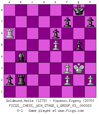Last move : 0-1 2018 December 20 20:11:36 [Event "FICGS__CHESS__WCH_STAGE_1_GROUP_03__000020"] [Site "FICGS"] [Date "2018.11.01"] [Round "1"] [White "Goldmund,Heike"] [Black "Kopasov,Evgeny"] [Result "0-1"] [WhiteElo "1273"] [BlackElo "2070"] 1.e4 c5 2.c3 Nf6 3.e5 Nd5 4.Nf3 Nc6 5.d4 cxd4 6.cxd4 d6 7.Bc4 dxe5 8.dxe5 Ndb4 9.O-O Qxd1 10.Rxd1 Bg4 11.Bf4 Nc2 12.Nc3 Nxa1 13.Rxa1 Bxf3 14.gxf3 e6 15.Bb5 Rc8 16.Rd1 a6 17.Ba4 Be7 18.Ne4 b5 19.Bb3 Na5 20.Nd2 O-O 21.Be3 Rfd8 22.Bb6 Nxb3 23.Bxd8 Rxd8 24.axb3 Bb4 25.Kf1 Rxd2 26.Rc1 g5 27.Kg2 Rxb2 28.Rc6 a5 29.Rb6 a4 30.bxa4 bxa4 31.Kg3 a3 32.Ra6 a2 0-1 Sicilian : Alapin's variation (2.c3) Kingside Castling by player White (move 9) Kingside Castling by player Black (move 20) Player Black won this chess game. Follow this game move after move (download)Chess problems demand from the composer the same virtues that characterize all worthwhile art: originality, invention, conciseness, harmony, complexity, and splendid insincerity. (Vladimir Nabokov) Unter Putin wird alles Geld aus Russland wie von einem Staubsauger nach Moskau umgeleitet, das ist wie ein schwarzes Loch. (Garry Kasparov) El Peón aislado arroja penumbra sobre todo el tablero. (Aaron Nimzovich) Les Echecs ont trois composantes : le temps, l'espace et le matériel en dernier. (Mikhail Tal) Everything in life is luck. (Donald Trump)