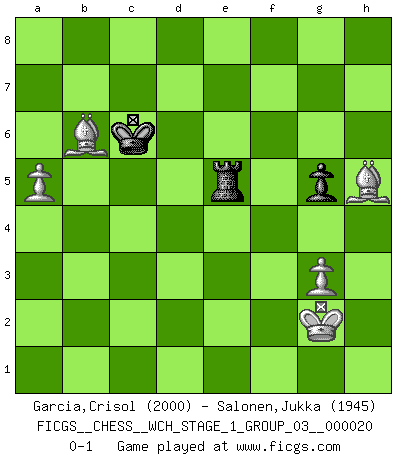 Last move : 0-1 2019 April 5 15:39:18 [Event "FICGS__CHESS__WCH_STAGE_1_GROUP_03__000020"] [Site "FICGS"] [Date "2018.11.01"] [Round "1"] [White "Garcia,Crisol"] [Black "Salonen,Jukka"] [Result "0-1"] [WhiteElo "2000"] [BlackElo "1945"] 1.d4 d5 2.Nf3 Nf6 3.c4 e6 4.Nc3 c6 5.e3 Nbd7 6.Qc2 Bd6 7.Bd3 O-O 8.O-O dxc4 9.Bxc4 a6 10.a4 c5 11.dxc5 Bxc5 12.Ne4 Nxe4 13.Qxe4 Nf6 14.Qh4 b6 15.b4 Bxb4 16.Bb2 Nd5 17.Qg3 f6 18.Rfd1 Bd6 19.Qg4 Ra7 20.e4 f5 21.exf5 Rxf5 22.Bd3 h5 23.Qe4 Raf7 24.Nd4 Nf6 25.Nxe6 Bxh2+ 26.Kh1 Nxe4 27.Nxd8 Nxf2+ 28.Kxh2 Nxd1 29.Rxd1 Rd7 30.Bxf5 Rxd1 31.Bxc8 Rxd8 32.Bxa6 Re8 33.Bc4+ Kh8 34.Bb5 Re3 35.Bd4 Re6 36.Kg3 Rg6+ 37.Kf3 Kg8 38.Be5 Kf8 39.g3 Ke7 40.Bd3 Rg5 41.Bc7 Rd5 42.Ke4 Rg5 43.Kf3 Rd5 44.Ke4 Rg5 45.Be2 Ke6 46.Kf3 Rf5+ 47.Kg2 g6 48.Bxb6 Kd6 49.Bf3 g5 50.Bxh5 Kc6 51.a5 Re5 0-1 Queen's pawn game Kingside Castling by player Black (move 7) Kingside Castling by player White (move 8) 10 pieces endgame at move 32 : White KBBPP , Black KRPPP WHITE : King + 2 Bishops 2 Pawns BLACK : King + 1 Rook 3 Pawns 9 pieces endgame at move 48 : White KBBPP , Black KRPP WHITE : King + 2 Bishops 2 Pawns BLACK : King + 1 Rook 2 Pawns 8 pieces endgame at move 50 : White KBBPP , Black KRP WHITE : King + 2 Bishops 2 Pawns BLACK : King + 1 Rook 1 Pawn Player Black won this chess game. Follow this game move after move (download)Chess is not like life... it has rules ! (Mark Pasternak) Ohne ihre Erfolge schmälern zu wollen würde ich sagen Petrosian, Spassky und Karpov verdanken ihre Siege ihren Trainern - Boleslavsky, Bondarevsky und Furman. (Mikhail Moiseyevich Botvinik) Yo he agregado estos principios a la ley: pongan los Caballos en acción antes de que los dos Alfiles sean desarrollados. (Emanuel Lasker) Un footballeur joue avec ses pieds, parfois avec sa tête. Un joueur d'échecs ne joue qu'avec sa tête. Et quand il ne joue plus, il meurt. (Jacob Murray) Excelling at chess has long been considered a symbol of more general intelligence. That is an incorrect assumption in my view, as pleasant as it might be. But for the purposes of argument and investigation, chess is, in Russkin-Gutman's words, 'an unparalleled laboratory, since both the learning process and the degree of ability obtained can be objectified and quantified, providing an excellent comparative framework on which to use rigorous analytical techniques.' (The Chess Master and the Computer, by Garry Kasparov - 2010)