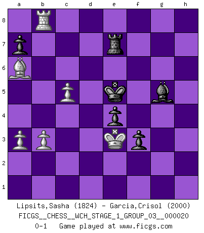 Last move : 0-1 2019 March 10 14:20:55 [Event "FICGS__CHESS__WCH_STAGE_1_GROUP_03__000020"] [Site "FICGS"] [Date "2018.11.01"] [Round "1"] [White "Lipsits,Sasha"] [Black "Garcia,Crisol"] [Result "0-1"] [WhiteElo "1824"] [BlackElo "2000"] 1.e4 e6 2.d4 d5 3.Nc3 Nf6 4.Bg5 dxe4 5.Nxe4 Be7 6.Bxf6 gxf6 7.Nf3 f5 8.Nc3 Bf6 9.Qe2 c5 10.dxc5 Nd7 11.Qe3 Qa5 12.Nd4 Qxc5 13.O-O-O Qe5 14.Qf3 Qc5 15.Nb3 Qb4 16.a3 Qg4 17.Qxg4 fxg4 18.Ne4 Ke7 19.h3 h5 20.c3 Be5 21.hxg4 hxg4 22.Rxh8 Bxh8 23.g3 Be5 24.Ned2 Bc7 25.Bg2 Bb6 26.Nd4 Ne5 27.Kc2 f5 28.Rh1 Kf6 29.Rh6+ Kg7 30.Rh5 Rb8 31.f4 gxf3 32.N2xf3 Nc4 33.Bh3 Bd8 34.b3 Ne3+ 35.Kd2 Nd5 36.Bf1 Nf6 37.Rh3 Ne4+ 38.Kc2 Bf6 39.Bc4 Nf2 40.Rh2 Ng4 41.Re2 e5 42.Ne6+ Bxe6 43.Bxe6 Kg6 44.Nh2 Nxh2 45.Rxh2 Re8 46.Bd5 e4 47.Bxb7 Be5 48.Rg2 Re7 49.Ba8 Bc7 50.Bb7 Bb8 51.Ba6 Kf6 52.c4 Rg7 53.Rd2 Bxg3 54.Rd8 Re7 55.Kd2 f4 56.c5 f3 57.Ke3 Ke5 58.Rf8 Bh4 59.Rb8 Bg5+ 0-1 French : Burn variation Queenside Castling by player White (move 13) Player Black won this chess game. Follow this game move after move (download)Could we look into the head of a Chess player, we should see there a whole world of feelings, images, ideas, emotion and passion. (Alfred Binet) Matt entspricht nicht immer den Tatsachen. (Savielly Grigorievitsch Tartakower) Preferería tener un Peón que un dedo. (Reuben Fine) Même si l'adversaire joue le coup analysé précédemment, recommencez l'analyse en voyant la nouvelle position. Première règle de Blumenfeld Macintosh - we might not get everything right, but at least we knew the century was going to end. (Douglas Adams)