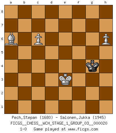 Last move : 1-0 2019 June 22 7:46:14 [Event "FICGS__CHESS__WCH_STAGE_1_GROUP_03__000020"] [Site "FICGS"] [Date "2018.11.01"] [Round "1"] [White "Pech,Stepan"] [Black "Salonen,Jukka"] [Result "1-0"] [WhiteElo "1680"] [BlackElo "1945"] 1.c4 Nf6 2.Nc3 e5 3.Nf3 Nc6 4.g3 d5 5.cxd5 Nxd5 6.Bg2 Nb6 7.O-O Be7 8.d3 O-O 9.a3 Be6 10.b4 f5 11.Bb2 a6 12.Na4 Nxa4 13.Qxa4 Qd7 14.Qc2 Bf6 15.Nd2 Bd5 16.e4 fxe4 17.Nxe4 Be7 18.Rac1 Rad8 19.Bc3 Qe8 20.Rfe1 Rf5 21.Rb1 h6 22.Qb2 Qf7 23.Re2 Rf8 24.Rbe1 Rd8 25.Re3 Kh7 26.Bh3 Rf3 27.Rxf3 Qxf3 28.Bg2 Qh5 29.Rf1 Kg8 30.f4 exf4 31.Bxg7 fxg3 32.h3 Qg6 33.Bc3 Qe6 34.Re1 Qf5 35.Re3 Bh4 36.Rf3 Qe6 37.Rf4 Bg5 38.Rg4 Bxe4 39.Bxe4 Kf7 40.Qg2 Nd4 41.Rxg3 Bf6 42.Rg6 c6 43.Kh1 Ke7 44.b5 c5 45.bxa6 bxa6 46.Rxh6 Rh8 47.Rxh8 Bxh8 48.Qg5+ Kd7 49.Qd5+ Qxd5 50.Bxd5 Kc7 51.h4 Kd6 52.Bc4 Bf6 53.h5 Ke7 54.Bd2 Nf3 55.Ba5 Nd4 56.Bb6 Kd6 57.a4 Nf5 58.Kh2 Ne3 59.Bxa6 Nd5 60.Ba5 Nc3 61.Bb5 Ke6 62.Kg3 Kf5 63.Kf3 Kg5 64.Be8 Kh6 65.Kg4 Kg7 66.Kf5 Bd4 67.Bd8 Nd5 68.a5 Nb4 69.Bb5 Kh7 70.a6 c4 71.dxc4 Bc5 72.Bg5 Nc2 73.Ke4 Nb4 74.Be3 Nxa6 75.Bxa6 Bxe3 76.Kxe3 Kh6 77.c5 Kg5 78.c6 Kg4 79.h6 1-0 English Opening Kingside Castling by player White (move 7) Kingside Castling by player Black (move 8) 10 pieces endgame at move 59 : White KBBPPP , Black KBNP WHITE : King + 2 Bishops 3 Pawns BLACK : King + 1 Bishop 1 Knight 1 Pawn 9 pieces endgame at move 71 : White KBBPPP , Black KBN WHITE : King + 2 Bishops 3 Pawns BLACK : King + 1 Bishop 1 Knight 8 pieces endgame at move 74 : White KBBPP , Black KBN WHITE : King + 2 Bishops 2 Pawns BLACK : King + 1 Bishop 1 Knight 7 pieces endgame at move 75 : White KBBPP , Black KB WHITE : King + 2 Bishops 2 Pawns BLACK : King + 1 Bishop 6 pieces endgame at move 75 : White KBPP , Black KB WHITE : King + 1 Bishop 2 Pawns BLACK : King + 1 Bishop 5 pieces endgame at move 76 : White KBPP , Black K WHITE : King + 1 Bishop 2 Pawns BLACK : King + Player White won this chess game. Follow this game move after move (download)Up to this point White has been following well-known analysis. But now he makes a fatal error: he begins to use his own head. (Siegbert Tarrasch) Ein Buch ist ein Spiegel; wenn ein Affe hineinsieht, so kann kein Apostel heraus gucken. (Georg Christoph Lichtenberg) Un jugador que es sorprendido, esta derrotado a medias. (Proverbio) Le succès, c'est être capable d'aller d'échec en échec sans perdre son enthousiasme. (Winston Churchill) He is a liar. I just don't know what the lie is yet. (Horatio Caine, C.S.I. Miami)