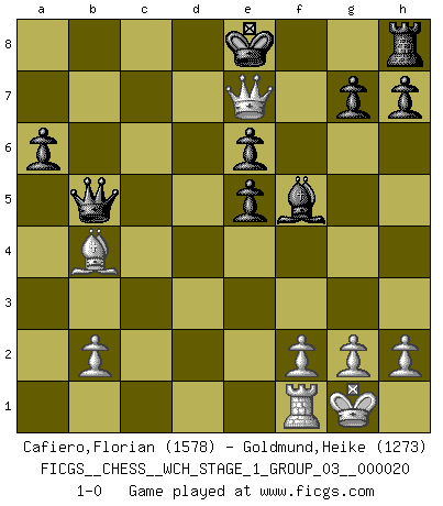 Last move : 1-0 2019 January 15 12:10:3 [Event "FICGS__CHESS__WCH_STAGE_1_GROUP_03__000020"] [Site "FICGS"] [Date "2018.11.01"] [Round "1"] [White "Cafiero,Florian"] [Black "Goldmund,Heike"] [Result "1-0"] [WhiteElo "1578"] [BlackElo "1273"] 1.e4 d5 2.exd5 Qxd5 3.Nc3 Qa5 4.d4 Nf6 5.Nf3 Bf5 6.Bb5+ c6 7.Ba4 b5 8.Bb3 e6 9.d5 cxd5 10.O-O a6 11.Bd2 Nbd7 12.Nxd5 b4 13.Nxf6+ Nxf6 14.a3 Bd6 15.axb4 Qb6 16.Ba4+ Nd7 17.c4 Rd8 18.c5 Bxc5 19.bxc5 Qxc5 20.Rc1 Qb6 21.Bxd7+ Rxd7 22.Rc8+ Rd8 23.Qa4+ Qb5 24.Rxd8+ Kxd8 25.Qd4+ Ke7 26.Bb4+ Ke8 27.Ne5 f6 28.Qa7 fxe5 29.Qe7+ 1-0 Scandinavian defense Kingside Castling by player White (move 10) Player White won this chess game. Follow this game move after move (download)It was clear to me that the vulnerable point of the American Grandmaster (Bobby Fischer) was in double-edged, hanging, irrational positions, where he often failed to find a win even in a won position. (Efim Geller) Fischer ist das größte Genie, das je vom Schachhimmel heruntergestiegen ist. (Mikhail Nekhemyevich Tal) El pensamiento metódico es mas útil en el Ajedrez que la inspiración. (C. J. S. Purdy) Aux échecs, les retours au sommet sont rares : les dommages psychologiques consécutifs à une défaite sont trop sévères. (Daily Telegraph) They say in chess you've got to kill the queen, and then you mate it... Oh I, do you ? (Red Hot Chili Peppers, Fortune faded)