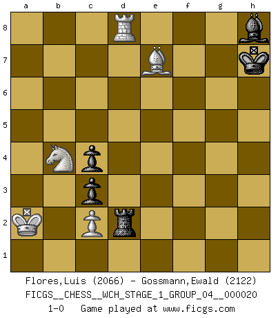 Last move : 1-0 2019 January 2 22:15:7 [Event "FICGS__CHESS__WCH_STAGE_1_GROUP_04__000020"] [Site "FICGS"] [Date "2018.11.01"] [Round "1"] [White "Flores,Luis"] [Black "Gossmann,Ewald"] [Result "1-0"] [WhiteElo "2066"] [BlackElo "2122"] 1.e4 d6 2.d4 Nf6 3.Nc3 g6 4.Be3 Bg7 5.Qd2 c6 6.f3 b5 7.O-O-O Qa5 8.Kb1 Nbd7 9.h4 Nb6 10.a3 Rb8 11.Bd3 Nc4 12.Bxc4 bxc4 13.Ka1 h5 14.Nge2 Nd7 15.Rb1 Nf8 16.Rhe1 Rb7 17.Qd1 Bd7 18.Bf2 Nh7 19.Be3 O-O 20.Qd2 Bh8 21.Rg1 Rfb8 22.g4 hxg4 23.fxg4 Nf6 24.h5 Nxg4 25.hxg6 fxg6 26.Qc1 c5 27.Rg3 Rxb2 28.Rxb2 Qxa3+ 29.Ra2 Qxc1+ 30.Bxc1 cxd4 31.Rxa7 Nf6 32.Nf4 dxc3 33.e5 Ne4 34.Rxg6+ Kf8 35.exd6 Nxd6 36.Rxd6 exd6 37.Rxd7 Kg8 38.Nd5 Ra8+ 39.Kb1 Rb8+ 40.Ka2 Ra8+ 41.Ba3 Re8 42.Bxd6 Re2 43.Rd8+ Kh7 44.Nb4 Rd2 45.Be7 1-0 Pirc defense Queenside Castling by player White (move 7) Kingside Castling by player Black (move 19) 10 pieces endgame at move 42 : White KRBNP , Black KRBPP WHITE : King + 1 Rook 1 Bishop 1 Knight 1 Pawn BLACK : King + 1 Rook 1 Bishop 2 Pawns Player White won this chess game. Follow this game move after move (download)The Chess pieces are the block alphabet which shapes thoughts; and these thoughts, although making a visual design on the chessboard, express their beauty abstractly, like a poem. (Marcel Duchamp) Er war ein guter Schachspieler, aber ich kann Leute nicht ausstehen, die 'Heil Hitler' rufen (Über Alexander Aljechin). (Miguel Najdorf) El Ajedrez es 99 por ciento táctica. (Teichmann) Karpov est une pièce de musée. (Garry Kasparov) Bobby never cared about money, though. His only desire was to prove that his choices were correct: He wanted chess to be important because he was a chess player, and he wanted to be important. Bobby knew money was important, but he didn't have a clue why, outside of clothes and status. The only way he could accomplish what he wanted was to fight for a lot of money. Once he got it, he gave it away. He did not know how to spend it. And once he'd become champion, after, essentially, sacrificing his life for it, he didn't know how to spend his time. (Bob Wade)