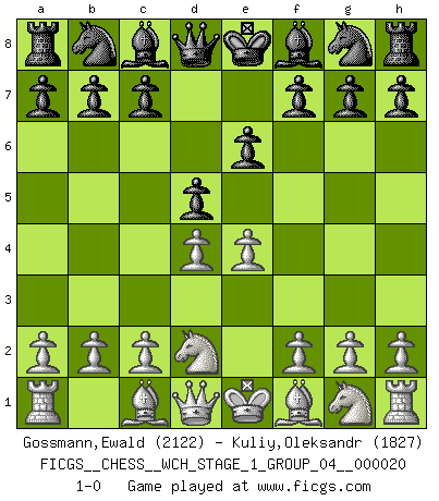 Last move : 1-0 2018 December 4 0:17:29 [Event "FICGS__CHESS__WCH_STAGE_1_GROUP_04__000020"] [Site "FICGS"] [Date "2018.11.01"] [Round "1"] [White "Gossmann,Ewald"] [Black "Kuliy,Oleksandr"] [Result "1-0"] [WhiteElo "2122"] [BlackElo "1827"] 1.e4 e6 2.d4 d5 3.Nd2 1-0 This chess game has been lost on time (started : 2018.11.01 15:27:33) French : Tarrasch Player White won this chess game. Follow this game move after move (download)The tactician knows what to do when there is something to do; whereas the strategian knows what to do when there is nothing to do. (Gerald Abrahams) Es gibt keine einzige Frau, der ich nicht einen Springer vorgeben könnte und trotzdem gewänne. (Robert James Fischer) El Ajedrez es la vida. (Bobby Fischer) Même un GMI sait rarement calculer sur plus de cinq coups une attaque à sacrifices. (Rudolf Spielmann) For a mechanic, you seem to do an excessive amount of thinking. (C-3PO in Star Wars ep.2)