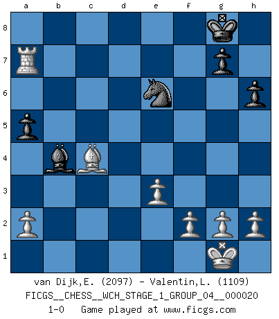 Last move : 1-0 2019 January 13 7:44:57 [Event "FICGS__CHESS__WCH_STAGE_1_GROUP_04__000020"] [Site "FICGS"] [Date "2018.11.01"] [Round "1"] [White "van Dijk,Erik L."] [Black "Valentin,Laurentiu"] [Result "1-0"] [WhiteElo "2097"] [BlackElo "1109"] 1.d4 d5 2.c4 e6 3.Nc3 Nf6 4.cxd5 exd5 5.Bg5 Be7 6.e3 O-O 7.Bd3 Be6 8.Nge2 a6 9.O-O Nbd7 10.Nf4 c5 11.Rc1 Rc8 12.dxc5 Nxc5 13.Bb1 b5 14.Bxf6 Bxf6 15.Ncxd5 Bxd5 16.Qxd5 Qxd5 17.Nxd5 Bxb2 18.Rc2 Be5 19.Ne7+ Kh8 20.Nxc8 Rxc8 21.Rd1 Bf6 22.Rd5 Be7 23.Rd7 Nxd7 24.Rxc8+ Nf8 25.Rc7 Bb4 26.Rxf7 Kg8 27.Ra7 a5 28.Bd3 h6 29.Bxb5 Ne6 30.Bc4 1-0 QGD : Exchange, positional line Kingside Castling by player Black (move 6) Kingside Castling by player White (move 9) Player White won this chess game. Follow this game move after move (download)Excellence at Chess is one mark of a scheming mind. (Sir Arthur Conan Doyle) Das Schachspiel hat wie die Liebe, die Musik, die Fähigkeit, den Menschen glücklich zu machen. Ich habe ein leises Gefühl des Bedauerns für jeden, der das Schachspiel nicht kennt, so wie ich jeden bedaure, der die Liebe nicht kennt. (Siegbert Tarrasch) Si un gobernante no entiende al Ajedrez, ¿como puede governar él un reinado?. (El Rey Khusros II) Tous ces prétendus hommes politiques sont les pions, les Cavaliers, les Tours ou les Fous d'une partie d'échecs qui se jouera tant qu'un hasard ne renversera pas l'échiquier. (Honoré de Balzac) I just play for fun. (Anna Kournikova)