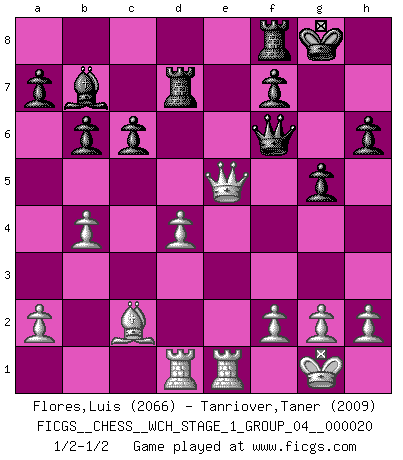 Last move : 1/2-1/2 2019 February 12 17:50:57 [Event "FICGS__CHESS__WCH_STAGE_1_GROUP_04__000020"] [Site "FICGS"] [Date "2018.11.01"] [Round "1"] [White "Flores,Luis"] [Black "Tanriover,Taner"] [Result "1/2-1/2"] [WhiteElo "2066"] [BlackElo "2009"] 1.d4 d5 2.Nf3 Nf6 3.c4 e6 4.Nc3 Be7 5.Bg5 O-O 6.e3 h6 7.Bh4 b6 8.Be2 Bb7 9.Bxf6 Bxf6 10.cxd5 exd5 11.b4 Qd6 12.Rb1 c6 13.O-O Nd7 14.e4 dxe4 15.Nxe4 Qf4 16.Nxf6+ Nxf6 17.Re1 Rac8 18.Qb3 Rc7 19.Rbc1 Ne4 20.Bd3 Ng5 21.Nxg5 Qxg5 22.Be4 Rd7 23.Qe3 Qd8 24.Rcd1 Qf6 25.Bc2 g5 26.Qe5 1/2-1/2 Queen's pawn game Kingside Castling by player Black (move 5) Kingside Castling by player White (move 13) This chess game ended in a draw. Follow this game move after move (download)Let the perfectionist play postal. (Yasser Seirawan) Der Freibauer hat für mich eine Seele, genau wie der Mensch, Wünsche, die unerkannt in ihm schlummern, und Befürchtungen, von deren Existenz er selbst kaum ahnt. (Aaron Nimzowitsch) Hay dos clases de hombres: aquellos que se conforman en dejarse llevar por las circunstancias y que juegan barajas y aquellos decididos a controlar las circunstancias y que juegan al Ajedrez. (Mortimer Collins) Aidez vos pièces, elles vous aideront. (Paul Morphy) I've never seen so many men wasted so badly. (Blondie in The Good, The Bad and The Ugly)