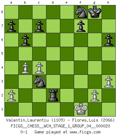 Last move : 0-1 2018 December 29 19:19:7 [Event "FICGS__CHESS__WCH_STAGE_1_GROUP_04__000020"] [Site "FICGS"] [Date "2018.11.01"] [Round "1"] [White "Valentin,Laurentiu"] [Black "Flores,Luis"] [Result "0-1"] [WhiteElo "1109"] [BlackElo "2066"] 1.d4 Nf6 2.c4 g6 3.Nc3 Bg7 4.Nf3 O-O 5.Bg5 d6 6.e3 Nbd7 7.Bd3 h6 8.Bh4 e5 9.dxe5 dxe5 10.Bc2 b6 11.O-O Bb7 12.Be4 Bxe4 13.Nxe4 g5 14.Nfxg5 Nxe4 15.Ne6 Qxh4 16.Nxf8 Nxf8 17.Qc2 Nc5 18.b4 Nce6 19.f4 exf4 20.exf4 Bd4+ 21.Kh1 Bxa1 22.Rxa1 Qxf4 23.Rc1 Rd8 24.h3 Rd2 25.Qc3 Nd4 26.Re1 Qf2 27.Rg1 Qxg1+ 28.Kxg1 Ne2+ 29.Kf1 Nxc3 0-1 King's Indian defense, 3.Nc3 Kingside Castling by player Black (move 4) Kingside Castling by player White (move 11) Player Black won this chess game. Follow this game move after move (download)Fischer is an American Chess tragedy on par with Morphy and Pillsbury. (Mig Greengard) Oft bringt ein stiller Zug das Erdbeben. (Richard Reti) El Jaque al descubierto es el bombardero del tablero. (Reuben Fine) Les Echecs sont affaire de jugement sensible. Savoir quand frapper et quand esquiver. (Fischer) For peace of mind, resign as general manager of the universe. (Douglas Adams)