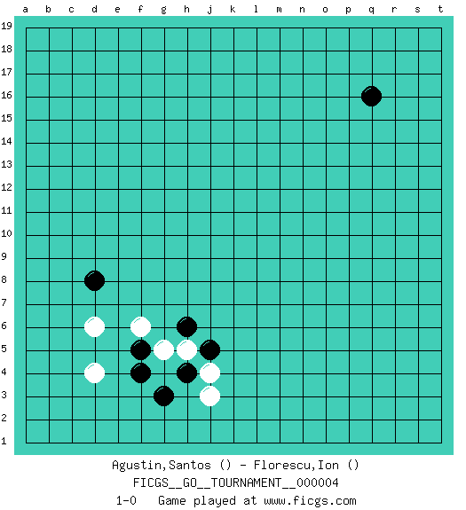 Last move : 1-0 2006 July 20 14:20:49 [Event "FICGS__GO__TOURNAMENT__000004"] [Site "FICGS"] [Date "2006.06.08"] [Round "1"] [Black "Agustin,Santos"] [White "Florescu,Ion"] [Result "1-0"] 1.q16 d4 2.f4 d6 3.d8 f6 4.h6 g5 5.h4 h5 6.j5 j4 7.g3 j3 8.f5 1-0 This go game has been lost on time (started : 2006.06.08 14:53:11) Here are the names of the openings (joseki) played in the four corners : Corner d4 : d4 f4 Hoshi (Hwajeom, Seongjeom, Xingwei`) 4-4 Point. The star or hoshi (4-4) point, emphasizing influence at the potential expense of territory. Ikken Takagakari (Hankan Nop'dakeolch'im, Yi Gaojia, 1-Space High Approach). White typically responds at 6-4 or 3-10. White 4-10 is played when White finds play on the right side advantageous. White 4-8 or 3-8 may be played when White has support at top. Player Black won this Go (weiqi, baduk) game. Follow this game move after move (download)On the second line six die, eight live. (Anonymous) It is the aim of the modern school, not to treat every position according to one general law, but according to the principle inherent in the position. (Richard Reti)