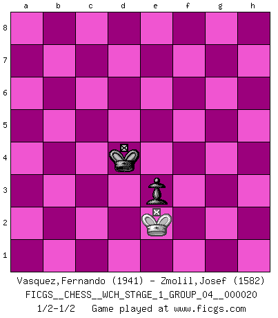 Last move : 1/2-1/2 2019 April 27 19:57:42 [Event "FICGS__CHESS__WCH_STAGE_1_GROUP_04__000020"] [Site "FICGS"] [Date "2018.11.01"] [Round "1"] [White "Vasquez,Fernando"] [Black "Zmolil,Josef"] [Result "1/2-1/2"] [WhiteElo "1941"] [BlackElo "1582"] 1.e4 c5 2.c3 Nf6 3.e5 Nd5 4.Nf3 Nc6 5.Bc4 Nb6 6.Bb3 c4 7.Bc2 d6 8.exd6 Qxd6 9.O-O Bg4 10.h3 Bh5 11.Re1 O-O-O 12.Be4 Qd7 13.Qc2 Bxf3 14.Bxf3 h5 15.b3 g5 16.Be4 g4 17.Na3 gxh3 18.Nxc4 Rg8 19.Nxb6+ axb6 20.d4 e6 21.d5 Ne5 22.g3 Bc5 23.Bf4 Ng4 24.Rf1 h4 25.b4 Bd6 26.dxe6 fxe6 27.Rad1 Qc7 28.Rxd6 Rxd6 29.Bxd6 Qxd6 30.Bxb7+ Kb8 31.Qh7 Rf8 32.Be4 h2+ 33.Kh1 Nxf2+ 34.Rxf2 Qd1+ 35.Kxh2 Rxf2+ 36.Kh3 Qf1+ 37.Kg4 Rf7 38.Qh8+ Kc7 39.Qe5+ Kd7 40.Kxh4 Qf6+ 41.Qxf6 Rxf6 42.a4 Rf1 43.Bd3 Rc1 44.Bb5+ Kd6 45.a5 bxa5 46.bxa5 Rxc3 47.a6 Rb3 48.Be2 Ke5 49.g4 Kf4 50.g5 Rg3 51.a7 Ra3 52.Bc4 Rxa7 53.Kh5 e5 54.g6 Kf5 55.Bd3+ Kf6 56.Kg4 Ra3 57.Bc2 Rc3 58.Be4 Rc1 59.Kf3 Rh1 60.Kg2 Rh4 61.Kf3 Rf4+ 62.Ke3 Rg4 63.Kf3 Rg1 64.Bd3 Rxg6 65.Bxg6 Kxg6 66.Ke4 Kf6 67.Ke3 Kf5 68.Kf3 e4+ 69.Ke3 Ke5 70.Ke2 Kd4 71.Kd2 e3+ 72.Ke2 1/2-1/2 Sicilian : Alapin's variation (2.c3) Kingside Castling by player White (move 9) Queenside Castling by player Black (move 11) 10 pieces endgame at move 41 : White KBPPPP , Black KRPP WHITE : King + 1 Bishop 4 Pawns BLACK : King + 1 Rook 2 Pawns 9 pieces endgame at move 45 : White KBPPP , Black KRPP WHITE : King + 1 Bishop 3 Pawns BLACK : King + 1 Rook 2 Pawns 8 pieces endgame at move 46 : White KBPPP , Black KRP WHITE : King + 1 Bishop 3 Pawns BLACK : King + 1 Rook 1 Pawn 7 pieces endgame at move 46 : White KBPP , Black KRP WHITE : King + 1 Bishop 2 Pawns BLACK : King + 1 Rook 1 Pawn 6 pieces endgame at move 52 : White KBP , Black KRP WHITE : King + 1 Bishop 1 Pawn BLACK : King + 1 Rook 1 Pawn 5 pieces endgame at move 64 : White KB , Black KRP WHITE : King + 1 Bishop BLACK : King + 1 Rook 1 Pawn 4 pieces endgame at move 65 : White KB , Black KP WHITE : King + 1 Bishop BLACK : King + 1 Pawn 3 pieces endgame at move 65 : White K , Black KP WHITE : King + BLACK : King + 1 Pawn This chess game ended in a draw. Follow this game move after move (download)I have never in my life played the French Defence, which is the dullest of all openings. (Wilhelm Steinitz) Gott hat gewollt, dass ich Champion werde. (Surab Azmajparaschvili) Aquellos que dicen entender al Ajedrez, no entienden nada. (Robert Hubner) A chaque perte on perd un peu de soi. (Joël Lautier) A computer lets you make more mistakes faster than any invention in human history - with the possible exceptions of handguns and tequila. (Mitch Ratcliffe)