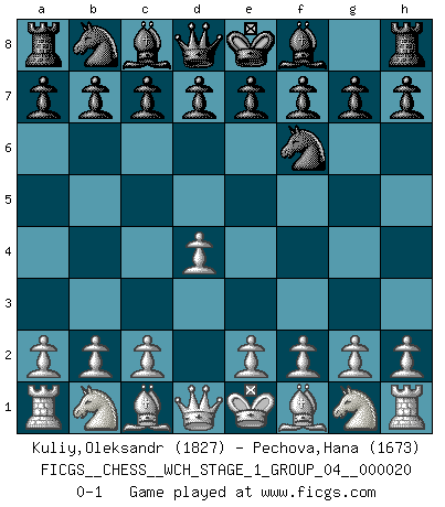 Last move : 0-1 2018 December 7 0:43:22 [Event "FICGS__CHESS__WCH_STAGE_1_GROUP_04__000020"] [Site "FICGS"] [Date "2018.11.01"] [Round "1"] [White "Kuliy,Oleksandr"] [Black "Pechova,Hana"] [Result "0-1"] [WhiteElo "1827"] [BlackElo "1673"] 1.d4 Nf6 0-1 This chess game has been lost on time (started : 2018.11.01 15:27:33) Queen's pawn game Player Black won this chess game. Follow this game move after move (download)First-class players lose to second-class players because second-class players sometimes play a first-class game. (Siegbert Tarrasch) Die Auseinandersetzung mit Karpow war politisch geprägt. Er stand für das kommunistische System, wurde von dessen Repräsentanten gehätschelt. Ich war der Oppositionelle. Jeder Schachweltmeister spiegelt auch die gesellschaftlichen Verhältnisse wider. Kramnik steht für die Börsen-Generation des Neuen Markts, ideologiefrei, zahlenfixiert. (Garry Kasparov) El jugador táctico debe saber que hacer cuando algo se debe de hacer. El estratégico debe saber que hacer cuando nada se debe de hacer. (Savielly Tartakover) Soyez une menace à chaque fois que vous vous asseyez pour jouer. (Ken Smith) Winning isn't everything... but losing is nothing. (Mednis)