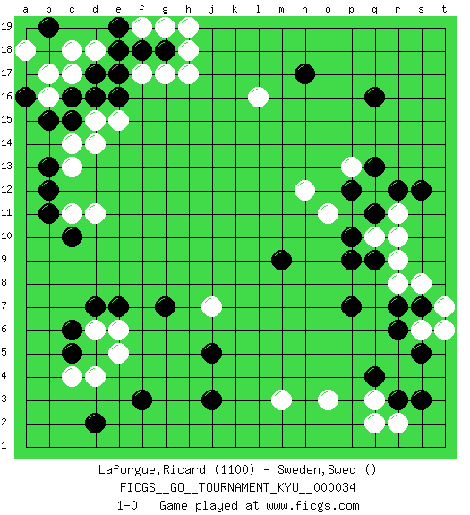 Last move : 1-0 2007 September 9 1:33:23 [Event "FICGS__GO__TOURNAMENT_KYU__000034"] [Site "FICGS"] [Date "2007.05.23"] [Round "1"] [Black "Laforgue,Ricard"] [White "Sweden,Swed"] [Result "1-0"] [Rating 1 "1100"] 1.q4 e15 2.q16 d4 3.f3 m3 4.j3 o3 5.c6 d6 6.d7 e5 7.c5 c4 8.d2 q3 9.r3 r2 10.s3 q2 11.r7 r9 12.r12 l16 13.p12 d11 14.e7 e6 15.g7 n12 16.n17 h17 17.d17 c17 18.c16 c18 19.e16 d18 20.e18 d15 21.d16 f17 22.f18 g17 23.e17 b16 24.b15 b17 25.c15 d14 26.b19 a18 27.a16 f19 28.g18 h18 29.b12 g19 30.e19 h19 31.c10 c11 32.b11 c13 33.b13 c14 34.p7 r11 35.q11 q10 36.p10 o11 37.q9 r10 38.p9 r8 39.s7 s8 40.s12 t7 41.s5 s6 42.r6 t6 43.j5 j7 44.m9 p13 45.q13 1-0 This go game has been lost on time (started : 2007.05.23 16:29:36) Here are the names of the openings (joseki) played in the four corners : Corner d4 : d4 f3 Hoshi (Hwajeom, Seongjeom, Xingwei`) 4-4 Point. The star or hoshi (4-4) point, emphasizing influence at the potential expense of territory. Ikken Kakari (Hankan Keolch'im, Yi Gua`jiao~, 1-Space Low Approach). Black 2 is the standard approach move to the 4-4. Corner q4 : q4 m3 Hoshi (Hwajeom, Seongjeom, Xingwei`) 4-4 Point. The star or hoshi (4-4) point, emphasizing influence at the potential expense of territory. Player Black won this Go (weiqi, baduk) game. Follow this game move after move (download)There is damezumari at the bamboo joint. (Anonymous) A clear conscience is usually the sign of a bad memory. (Unknown)