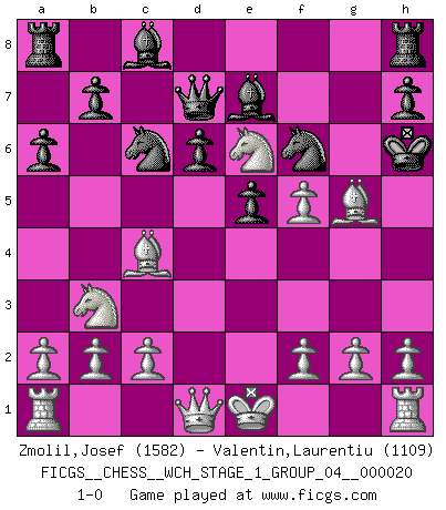 Last move : 1-0 2018 December 23 4:3:24 [Event "FICGS__CHESS__WCH_STAGE_1_GROUP_04__000020"] [Site "FICGS"] [Date "2018.11.01"] [Round "1"] [White "Zmolil,Josef"] [Black "Valentin,Laurentiu"] [Result "1-0"] [WhiteElo "1582"] [BlackElo "1109"] 1.e4 c5 2.Nf3 d6 3.d4 cxd4 4.Nxd4 a6 5.Nc3 e5 6.Nb3 Nc6 7.Be3 f5 8.Nd5 Nf6 9.Bb6 Qd7 10.Nc7+ Kf7 11.Bc4+ Kg6 12.exf5+ Kh6 13.Be3+ g5 14.Ne6 Be7 15.Bxg5+ 1-0 Sicilian Player White won this chess game. Follow this game move after move (download)It is not a move, even the best move that you must seek, but a realizable plan. (Eugene Znosko-Borovsky) Herr Iljumschinow ist ein etwas merkwürdiger Geschäftsmann: Er arbeitet zusammen mit Leuten wie Muammar al-Gaddafi; früher ist das Saddam Hussein gewesen. (Joel Lautier) La belleza de un movimiento no se refleja solo en su apariencia, sino en el pensamiento detrás de él. (Siegbert Tarrasch) On est toujours la mazette de quelqu'un d'autre. (Anonyme) Remember : Your focus determines your reality. (Qui-Gon Jinn in Star Wars ep.1)