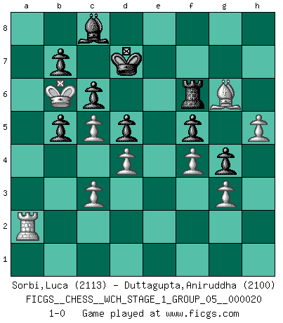Last move : 1-0 2019 April 7 8:48:14 [Event "FICGS__CHESS__WCH_STAGE_1_GROUP_05__000020"] [Site "FICGS"] [Date "2018.11.01"] [Round "1"] [White "Sorbi,Luca"] [Black "Duttagupta,Aniruddha"] [Result "1-0"] [WhiteElo "2113"] [BlackElo "2100"] 1.e4 d5 2.exd5 Qxd5 3.Nc3 Qd6 4.d4 Nf6 5.Nf3 c6 6.Ne5 Nbd7 7.Nc4 Qc7 8.Qf3 Nb6 9.Bf4 Qd7 10.Nxb6 axb6 11.O-O-O e6 12.Be5 Nd5 13.Bc4 f6 14.Bg3 Bb4 15.Nxd5 exd5 16.Bb3 Qf5 17.Rd3 Qxf3 18.Rxf3 Kf7 19.c3 Be7 20.Re3 b5 21.Rhe1 Re8 22.Bc2 Rxa2 23.Kb1 Ra8 24.Bxh7 Bd7 25.h4 Bf8 26.h5 Rxe3 27.Rxe3 g5 28.Bg6+ Kg7 29.b4 Kh6 30.f3 Ra3 31.Kb2 Ra8 32.Bh2 f5 33.f4 g4 34.Bg3 Kg7 35.Bh4 Bd6 36.Bg5 Rb8 37.g3 Rg8 38.Re2 Rh8 39.Be7 Bc7 40.Bg5 Bd6 41.Be7 Bc7 42.Bc5 Bd8 43.Kb3 Bf6 44.Ra2 Rd8 45.Ra7 Bc8 46.Kc2 Kh6 47.Ra8 Rg8 48.Bd6 Rd8 49.Bc7 Rf8 50.Bb6 Be7 51.Bc5 Bxc5 52.bxc5 Kg7 53.Kb3 Kf6 54.Kb4 Ke7 55.Ka5 Kd8 56.Kb6 Rf6 57.Ra7 Kd7 58.Ra2 1-0 Scandinavian : Pytel-Wade variation Queenside Castling by player White (move 11) Player White won this chess game. Follow this game move after move (download)Mistrust is the most necessary characteristic of the Chess player. (Siegbert Tarrasch) Irgendwie scheint mir sonntags früh um 9 Uhr der Killerinstinkt verloren gegangen zu sein. (Alexej Shirov) Cada Peón es una Reina en potencia. (James Mason) Tout change constamment, y compris dans le monde des Echecs. (Botvinnik) Thus, what is of supreme importance in war is to attack the enemy's strategy. (Sun Tzu)