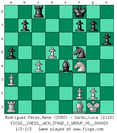 Last move : 1/2-1/2 2018 December 21 0:38:58 [Event "FICGS__CHESS__WCH_STAGE_1_GROUP_05__000020"] [Site "FICGS"] [Date "2018.11.01"] [Round "1"] [White "Rodriguez Perez,Rene"] [Black "Sorbi,Luca"] [Result "1/2-1/2"] [WhiteElo "2050"] [BlackElo "2113"] 1.e4 e5 2.Nf3 Nf6 3.Nxe5 d6 4.Nf3 Nxe4 5.d4 d5 6.Bd3 Nc6 7.O-O Be7 8.c4 Nb4 9.Be2 O-O 10.Nc3 Bf5 11.a3 Nxc3 12.bxc3 Nc6 13.Re1 Re8 14.Bf4 dxc4 15.Bxc4 Bd6 16.Rxe8+ Qxe8 17.Ng5 Bg6 18.Bxd6 cxd6 19.h4 Qe7 20.Qg4 h6 21.Nh3 Qe4 22.Qg3 Rc8 23.Bf1 Ne7 24.Qxd6 Nf5 25.Qb4 Nxh4 26.d5 a5 27.Qxe4 Bxe4 28.c4 Nf5 29.Nf4 Kf8 1/2-1/2 Petrov : Classical attack Kingside Castling by player White (move 7) Kingside Castling by player Black (move 9) This chess game ended in a draw. Follow this game move after move (download)A thorough understanding of the typical mating continuations makes the most complicated sacrificial combinations leading up to them not only not difficult, but almost a matter of course. (Siegbert Tarrasch) Zu meiner Zeit war ein 20 jähriger ein junger Spieler, heute ist er ein Veteran. (Garry Kasparov) La caracteristica mas importante en la posición del Ajedrez es la actividad de las piezas. Esto es absolutamente fundamental en todas las fases del juego: Apertura, Juego Medio y especialmente Finales. La limitación primordial en la actividad de una pieza, es la estructuración de los Peones. (Michael Stean) Votre seul travail dans les ouvertures est d'obtenir un milieu de partie jouable. (Lajos Portish) Macintosh - we might not get everything right, but at least we knew the century was going to end. (Douglas Adams)