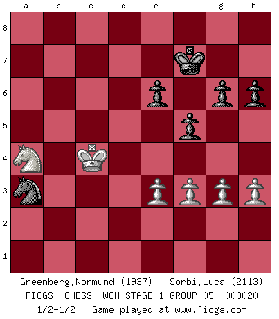 Last move : 1/2-1/2 2019 February 7 10:45:51 [Event "FICGS__CHESS__WCH_STAGE_1_GROUP_05__000020"] [Site "FICGS"] [Date "2018.11.01"] [Round "1"] [White "Greenberg,Normund"] [Black "Sorbi,Luca"] [Result "1/2-1/2"] [WhiteElo "1937"] [BlackElo "2113"] 1.d4 Nf6 2.Bf4 d5 3.e3 c5 4.Nf3 Nc6 5.Nbd2 Qb6 6.dxc5 Qxb2 7.Rb1 Qc3 8.Bb5 e6 9.O-O Be7 10.Bxc6+ bxc6 11.Ne5 Ba6 12.Nxc6 Qxc5 13.Nxe7 Bxf1 14.Qxf1 Qxe7 15.Qa6 O-O 16.Bd6 Qd8 17.Bxf8 Qxf8 18.c4 dxc4 19.Nxc4 Rb8 20.Rb7 Qc8 21.Rxb8 Qxb8 22.h3 h6 23.Nd6 Qc7 24.Qc8+ Qxc8 25.Nxc8 a5 26.f3 Nd5 27.Kf2 Nc3 28.a3 a4 29.Nb6 f5 30.Ke1 Kf7 31.Kd2 Nb1+ 32.Kd3 Nxa3 33.Nxa4 Nb5 34.g3 g6 35.Kc4 Na3+ 1/2-1/2 Queen's pawn game Kingside Castling by player White (move 9) Kingside Castling by player Black (move 15) This chess game ended in a draw. Follow this game move after move (download)If a ruler does not understand Chess, how can he rule over a kingdom ? (King Khusros II) Ein Remis kann durch Wiederholung von drei Zügen oder durch einen schlechte Zug erreicht werden. (Savielly Grigorievitsch Tartakower) Aquel que toma al Peón de Caballo de la Reina, se pasará la noche a dormir en la calle. (Anónimo) Les échecs c'est le défi de l'alpiniste, toujours plus haut, prêt à tout pour monter à l'assaut du Roi ennemi. Les échecs, c'est de la musique en mouvement, un ballet majestueux pour les yeux. C'est de la poésie composée par les fantômes du passé qui au même titre que Rimbaud ou Verlaine méritent notre admiration. Les échecs, c'est de la peinture ou le moindre mouvement modifie le tableau pour en faire un Picasso ou un Van Gogh. Les échecs, c'est tout et rien, c'est la vie et la mort. Jjulie33 sur le forum de France-Echecs. Optimism is a variety of information deficit. Sometimes especially true for correspondence chess games. (Michael Aigner)