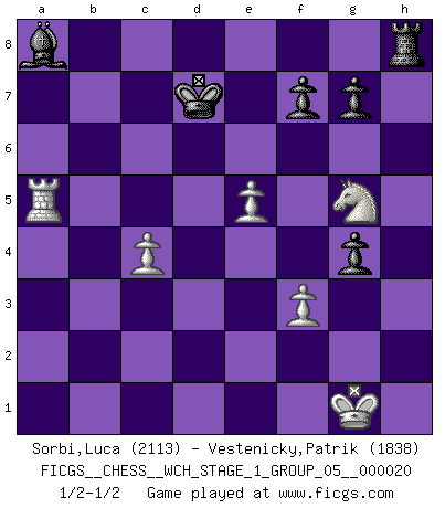 Last move : 1/2-1/2 2018 December 8 14:17:17 [Event "FICGS__CHESS__WCH_STAGE_1_GROUP_05__000020"] [Site "FICGS"] [Date "2018.11.01"] [Round "1"] [White "Sorbi,Luca"] [Black "Vestenicky,Patrik"] [Result "1/2-1/2"] [WhiteElo "2113"] [BlackElo "1838"] 1.e4 e5 2.Nf3 Nc6 3.Bb5 Nf6 4.O-O Nxe4 5.d4 Nd6 6.Bxc6 dxc6 7.dxe5 Nf5 8.Qxd8+ Kxd8 9.Nc3 Be6 10.Ng5 Ke7 11.Rd1 h6 12.Nf3 Rd8 13.Bd2 c5 14.h3 b6 15.a4 a5 16.Nb5 Rd7 17.g4 Nd4 18.Nfxd4 cxd4 19.b4 h5 20.bxa5 hxg4 21.axb6 cxb6 22.Bb4+ Ke8 23.Bxf8 Kxf8 24.Nxd4 Bd5 25.c4 Ba8 26.a5 Rxh3 27.f3 bxa5 28.Ne6+ Ke7 29.Rxd7+ Kxd7 30.Ng5 Rh8 31.Rxa5 1/2-1/2 Ruy Lopez : Berlin defense, Open variation Kingside Castling by player White (move 4) This chess game ended in a draw. Follow this game move after move (download)I believe that Chess possesses a magic that is also a help in advanced age. A rheumatic knee is forgotten during a game of Chess and other events can seem quite unimportant in comparison with a catastrophe on the chessboard. (Vlastimil Hort) Frage: Wie viele Autos haben Sie schon zerstört? - Antwort: Nur zwei. (Loek van Wely) Un entendimiento minucioso de las típicas continuaciones de mate hacen de las mas complicadas combinaciones de sacrificio que conducen hacia ellas no solo no dificiles, sino casi un asunto de rutina. (Siegbert Tarrasch) Les Echecs sont et restent toujours un combat, un combat intégral comme la boxe, la lutte ou un autre sport, et où il doit y avoir un vainqueur et un vaincu. (Joseph Emil Diemer) Inventor: A person who makes an ingenious arrangement of wheels, levers and springs, and believes it civilization. (Ambrose Bierce, The Devil's Dictionary)