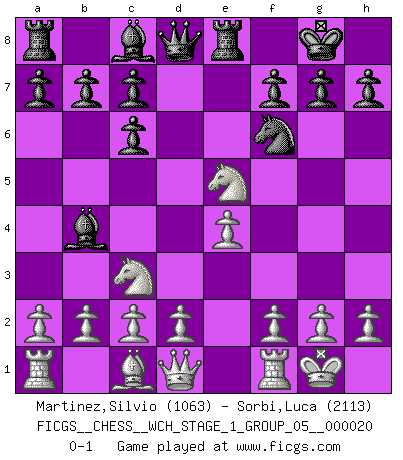 Last move : 0-1 2018 December 19 2:15:51 [Event "FICGS__CHESS__WCH_STAGE_1_GROUP_05__000020"] [Site "FICGS"] [Date "2018.11.01"] [Round "1"] [White "Martinez,Silvio"] [Black "Sorbi,Luca"] [Result "0-1"] [WhiteElo "1063"] [BlackElo "2113"] 1.e4 e5 2.Nf3 Nf6 3.Nc3 Nc6 4.Bb5 Bb4 5.Bxc6 dxc6 6.O-O O-O 7.Nxe5 Re8 0-1 This chess game has been lost on time (started : 2018.11.01 15:27:35) Petrov Three knights game Kingside Castling by player White (move 6) Kingside Castling by player Black (move 6) Player Black won this chess game. Follow this game move after move (download)In Chess, at least, the brave inherit the earth. (Edmar Mednis) Woher wissen wir, daß der Neanderthaler Blindschach gespielt hat? -- Bei Ausgrabungen wurden keine Schachbretter und Figuren gefunden. (Anonymous) Aquellos que dicen que entienden al Ajedrez, no entienden nada. (Robert Hubner) Donnez-moi un Cavalier en 6e et je gagnerais toutes mes parties. (Steinitz) The various flowers seem good to different people. (Chinese proverb)