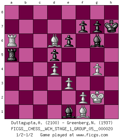 Last move : 1/2-1/2 2019 March 14 14:10:19 [Event "FICGS__CHESS__WCH_STAGE_1_GROUP_05__000020"] [Site "FICGS"] [Date "2018.11.01"] [Round "1"] [White "Duttagupta,Aniruddha"] [Black "Greenberg,Normund"] [Result "1/2-1/2"] [WhiteElo "2100"] [BlackElo "1937"] 1.d4 d5 2.Nf3 c6 3.c4 Nf6 4.Nc3 a6 5.c5 Bf5 6.Qb3 Ra7 7.Bf4 Nbd7 8.h3 e6 9.e3 Be7 10.Be2 O-O 11.O-O Ne4 12.Nxe4 Bxe4 13.Nd2 Bg6 14.Qc3 a5 15.a3 a4 16.Rfc1 b6 17.cxb6 Qxb6 18.Qxc6 Qxb2 19.Qc3 Rb7 20.Ba6 Qxc3 21.Rxc3 Rb2 22.Rc7 Rxd2 23.Rxd7 Bh4 24.g3 Bf6 25.Rc1 h5 26.Ra7 Ra2 27.Bb5 Rd8 28.Bf1 Kh7 29.Rxa4 Be7 30.Ra7 Bxa3 31.Rc6 Ra1 32.Kg2 Bb2 33.Rxa1 Bxa1 34.g4 hxg4 35.hxg4 Bb2 36.Bd6 Ra8 37.Ba6 Bc3 38.Bb5 Ra5 39.Bf1 Be1 40.Ra6 1/2-1/2 Queen's pawn game Kingside Castling by player Black (move 10) Kingside Castling by player White (move 11) This chess game ended in a draw. Follow this game move after move (download)Becoming successful at Chess allows you to discover your own personality. That's what I want for the kids I teach. (Saudin Robovic) Die unerbitterlichsten Regeln im Schach sind die Ausnahmen. (Savielly Grigorievitsch Tartakower) Las piezas de Ajedrez son los bloques del alfabeto que moldean los pensamientos; y esos pensamientos, aunque hagan un diseño visual en el tablero, expresan abstractamente su belleza como un poema. (Marcel Duchamp) Botvinnik disait en comparant les échecs à la musique: Il existe une science dont le but est l'étude de l'acoustique et des sons. Mais il y a aussi un art qui se sert de l'océan des sons : c'est la musique. De toute évidence, il en est de même pour la pensée. La logique est l'étude des lois de la réflexion et les échecs reflètent, en tant qu'art, le côté logique de la réflexion, sous la forme d'images artistiques... Extrait de Fischer - Spassky, Reykjavik 1972 par Alexander & F. Wyndham (Ed. Solar), p 37. Sometimes it pays to stay in bed in Monday, rather than spending the rest of the week debugging Monday's code. (Dan Salomon)