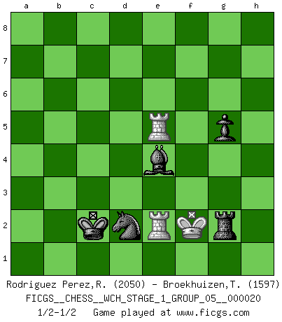 Last move : 1/2-1/2 2019 March 25 12:40:17 [Event "FICGS__CHESS__WCH_STAGE_1_GROUP_05__000020"] [Site "FICGS"] [Date "2018.11.01"] [Round "1"] [White "Rodriguez Perez,Rene"] [Black "Broekhuizen,Tom"] [Result "1/2-1/2"] [WhiteElo "2050"] [BlackElo "1597"] 1.e4 e5 2.Nf3 Nc6 3.Bb5 a6 4.Bxc6 dxc6 5.O-O Qd6 6.d4 exd4 7.Nxd4 Bd7 8.Nc3 O-O-O 9.Be3 Qg6 10.Qe2 Nf6 11.f3 Bd6 12.Kh1 h5 13.g3 Kb8 14.Rad1 Bc8 15.a4 Rde8 16.Rfe1 Be5 17.Qf1 c5 18.Nde2 Nd7 19.a5 Qc6 20.Nd5 f5 21.exf5 Rhf8 22.b4 Rxf5 23.bxc5 Nxc5 24.Nb4 Qb5 25.Nd4 Qxf1+ 26.Rxf1 Bxd4 27.Bxd4 Ne6 28.Bc3 Rc5 29.Rd3 b6 30.Rb1 Bb7 31.Re3 Ka7 32.Na2 Rf5 33.Rf1 R5f8 34.Re5 Bxf3+ 35.Kg1 Bg4 36.Nb4 Bh3 37.Rb1 Rf3 38.Bd2 h4 39.Nc6+ Kb7 40.Nd4 Nxd4 41.Rxe8 Rf5 42.Bf4 g5 43.Bxc7 Nf3+ 44.Kh1 Nd2 45.Rbe1 Kxc7 46.R8e7+ Kc6 47.R7e6+ Kd5 48.c4+ Kxc4 49.axb6 hxg3 50.hxg3 Bg4 51.Rc6+ Kd3 52.b7 Bf3+ 53.Kg1 Rb5 54.Rd6+ Kc2 55.Rxa6 Nc4 56.g4 Bxb7 57.Rae6 Kd3 58.Rd1+ Nd2 59.Kf2 Kc2 60.Rde1 Rb4 61.R6e5 Rxg4 62.R1e2 Be4 63.Ke1 Rg1+ 64.Kf2 Rg2+ 65.Ke1 Rg1+ 66.Kf2 Rg2+ 1/2-1/2 Ruy Lopez : Exchange, Bronstein variation Kingside Castling by player White (move 5) Queenside Castling by player Black (move 8) 10 pieces endgame at move 55 : White KRRPP , Black KRBNP WHITE : King + 2 Rooks 2 Pawns BLACK : King + 1 Rook 1 Bishop 1 Knight 1 Pawn 9 pieces endgame at move 56 : White KRRP , Black KRBNP WHITE : King + 2 Rooks 1 Pawn BLACK : King + 1 Rook 1 Bishop 1 Knight 1 Pawn 8 pieces endgame at move 61 : White KRR , Black KRBNP WHITE : King + 2 Rooks BLACK : King + 1 Rook 1 Bishop 1 Knight 1 Pawn This chess game ended in a draw. Follow this game move after move (download)Not all artists are Chess players, but all Chess players are artists. (Marcel Duchamp) Sicherlich können nur Meister einen Stil haben. Daß ein nicht-Meister auch nur ein einziges Mal in seinem Leben eine Partie folgerecht durchführte, habe ich niemals bemerkt. (Emanuel Lasker) Un entendimiento minucioso de las típicas continuaciones de mate hacen de las mas complicadas combinaciones de sacrificio que conducen hacia ellas no solo no dificiles, sino casi un asunto de rutina. (Siegbert Tarrasch) On est toujours la mazette de quelqu'un d'autre. (Anonyme) Luck is what you have left over after you give 100 percent. (Langston Coleman)
