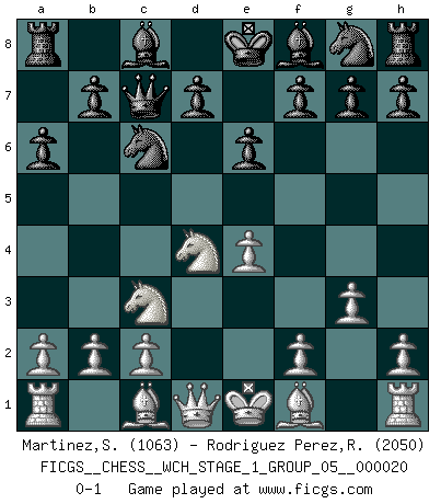Last move : 0-1 2018 December 14 13:46:26 [Event "FICGS__CHESS__WCH_STAGE_1_GROUP_05__000020"] [Site "FICGS"] [Date "2018.11.01"] [Round "1"] [White "Martinez,Silvio"] [Black "Rodriguez Perez,Rene"] [Result "0-1"] [WhiteElo "1063"] [BlackElo "2050"] 1.e4 e6 2.Nf3 c5 3.Nc3 a6 4.d4 cxd4 5.Nxd4 Qc7 6.g3 Nc6 0-1 This chess game has been lost on time (started : 2018.11.01 15:27:35) French defense Player Black won this chess game. Follow this game move after move (download)The beauty of a move lies not in its' appearance but in the thought behind it. (Siegbert Tarrasch) Rauchen ist dem Schachspieler bei seiner Arbeit, also im Wettkampf, untersagt. (Viktor Kortschnoi) Fischer es una tragedia del Ajedrez Americano a la par con Morphy y Pillsbury. (Mig Greengard) Dieu déplace le joueur, et celui-ci la pièce. Quel Dieu derrière Dieu commence donc la trame ? Arturo Perez-Reverte (prix de littérature policière 1993). In every real man a child is hidden that wants to play. (Friedrich Nietzsche)