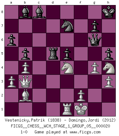 Last move : 1-0 2019 January 28 19:1:22 [Event "FICGS__CHESS__WCH_STAGE_1_GROUP_05__000020"] [Site "FICGS"] [Date "2018.11.01"] [Round "1"] [White "Vestenicky,Patrik"] [Black "Domingo,Jordi"] [Result "1-0"] [WhiteElo "1838"] [BlackElo "2012"] 1.d4 d5 2.Nf3 c5 3.c4 dxc4 4.e3 Nf6 5.Bxc4 e6 6.O-O a6 7.b3 Nc6 8.Bb2 cxd4 9.Nxd4 Bd7 10.Nf3 Be7 11.a3 O-O 12.Nbd2 Rc8 13.Qe2 b5 14.Bd3 Nd5 15.Rfd1 f5 16.e4 Nf4 17.Qe3 Nxd3 18.Qxd3 Qc7 19.Rac1 Rcd8 20.b4 Qf4 21.exf5 Qxf5 22.Qe3 Bd6 23.Qe2 Bb8 24.Ne4 e5 25.Nc5 Bc8 26.Rxd8 Rxd8 27.h3 Qg6 28.Kf1 Rd5 29.Qe1 Qd6 30.Qe4 h6 31.Qc2 Ne7 32.Qb3 Kh8 33.g4 Qf6 34.Re1 h5 35.Ne4 Qg6 36.Nh4 1-0 This chess game has been lost on time (started : 2018.11.01 15:27:35) Queen's pawn game, Krause variation Kingside Castling by player White (move 6) Kingside Castling by player Black (move 11) Player White won this chess game. Follow this game move after move (download)I like to say that Bobby Fischer was the greatest player ever. But what made Fischer a genius was his ability to blend an American freshness and pragmatism with Russian ideas about strategy. (Bruce Pandolfini) Gott hat gewollt, dass ich Champion werde. (Surab Azmajparaschvili) Durante una competencia de Ajedrez, un Maestro de Ajedrez deberá ser una combinación de presa de caza y un Monge. (Alexander Alekhine) Il s'avisa de me proposer d'apprendre les échecs qu'il jouait un peu... me voilà forcené des échecs. J'achète un échiquier, je m'enferme dans ma chambre, j'y passe des jours et des nuits à vouloir apprendre par cur toutes les parties. (Jean-Jacques Rousseau, Confessions) Whoever said the pen is mightier than the sword obviously never encountered automatic weapons. (US General Douglas MacArthur)