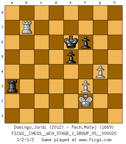 Last move : 1/2-1/2 2019 April 18 17:40:27 [Event "FICGS__CHESS__WCH_STAGE_1_GROUP_05__000020"] [Site "FICGS"] [Date "2018.11.01"] [Round "1"] [White "Domingo,Jordi"] [Black "Pech,Matej"] [Result "1/2-1/2"] [WhiteElo "2012"] [BlackElo "1669"] 1.e4 c5 2.Nf3 Nc6 3.d4 cxd4 4.Nxd4 Nf6 5.Nc3 e5 6.Ndb5 d6 7.Bg5 a6 8.Na3 b5 9.Nd5 Be7 10.Nxe7 Nxe7 11.Bxf6 gxf6 12.c4 f5 13.exf5 Nxf5 14.cxb5 Nd4 15.bxa6 Bxa6 16.Bxa6 Qa5+ 17.Qd2 Qxa6 18.Nc2 Nxc2+ 19.Qxc2 Rc8 20.Qd2 Rg8 21.f3 Qa4 22.b3 Qh4+ 23.Kf1 Qf6 24.Rd1 Qg6 25.Rg1 Rc2 26.Qxd6 Qxd6 27.Rxd6 Ke7 28.Rd1 Rxa2 29.Re1 Rc8 30.g4 R8c2 31.Rg3 f6 32.Rh3 Rxh2 33.Rxh2 Rxh2 34.Re2 Rh1+ 35.Kf2 Rb1 36.Ra2 Rxb3 37.Ra7+ Ke6 38.Rxh7 Ra3 39.Rb7 1/2-1/2 Sicilian : Pelikan (Lasker/Sveshnikov) variation 10 pieces endgame at move 33 : White KRPPP , Black KRPPP WHITE : King + 1 Rook 3 Pawns BLACK : King + 1 Rook 3 Pawns 9 pieces endgame at move 36 : White KRPP , Black KRPPP WHITE : King + 1 Rook 2 Pawns BLACK : King + 1 Rook 3 Pawns 8 pieces endgame at move 38 : White KRPP , Black KRPP WHITE : King + 1 Rook 2 Pawns BLACK : King + 1 Rook 2 Pawns This chess game ended in a draw. Follow this game move after move (download)I love all positions. Give me a difficult positional game, I will play it. But totally won positions, I cannot stand them. (Hein Donner) Es macht mich traurig, wenn ich sehe, dass Golfprofis mehr verdienen als Schachsportler. Obwohl ich davon überzeugt bin, dass wir Schachspieler viel härter trainieren müssen als die Golfer. (Alexandra Kosteniuk) El Ajedrez es tan inspirador que yo no creo que un buen jugador sea capaz de tener un pensamiento malo durante una partida. (Wilhelm Steinitz) D'abord les bases : Jouez et étudiez, puis étudiez et jouez, ensuite jouez et étudiez, puis étudiez et jouez. Deuxièmement : Donnez toujours le meilleur de vous-même ! (Ken Smith) Computer Science is no more about computers than astronomy is about telescopes. (Edsger W. Dijkstra)