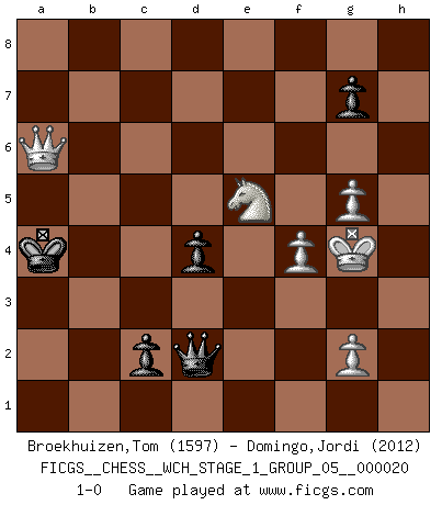 Last move : 1-0 2019 May 29 22:24:49 [Event "FICGS__CHESS__WCH_STAGE_1_GROUP_05__000020"] [Site "FICGS"] [Date "2018.11.01"] [Round "1"] [White "Broekhuizen,Tom"] [Black "Domingo,Jordi"] [Result "1-0"] [WhiteElo "1597"] [BlackElo "2012"] 1.e4 e5 2.Nf3 d6 3.d4 exd4 4.Nxd4 Nf6 5.Nc3 Be7 6.Bf4 O-O 7.Bc4 c6 8.O-O b5 9.Bb3 b4 10.Nce2 Nxe4 11.c3 bxc3 12.Nxc3 Nc5 13.Re1 Bg5 14.Bxg5 Qxg5 15.Qf3 Bd7 16.Rad1 h6 17.Nce2 d5 18.Bc2 Nba6 19.a3 Rfe8 20.b4 Ne4 21.Qd3 Nc7 22.Ng3 Nf6 23.Nf3 Rxe1+ 24.Rxe1 Qg4 25.Ne5 Qe6 26.h3 Re8 27.Re3 Nb5 28.Ng4 Ne4 29.f3 h5 30.Nxh5 f5 31.Bb3 fxg4 32.Rxe4 Qd6 33.hxg4 Nxa3 34.Qd4 Re7 35.Rxe7 Qxe7 36.Kf2 Nb5 37.Qd2 Qh4+ 38.Ng3 Qd8 39.Bc2 Qb6+ 40.Kf1 Nd4 41.Bg6 Qb5+ 42.Kg1 Qb6 43.Kh2 Ne6 44.Nf5 Qd8 45.Kg3 Nf8 46.Qc3 Qc7+ 47.f4 Ne6 48.Qd2 Kf8 49.Nh4 Qd6 50.Nf3 c5 51.Ne5 c4 52.g5 a6 53.Qe3 d4 54.Qe4 c3 55.Qa8+ Ke7 56.Qg8 Qc7 57.Be4 Kd6 58.Qa8 Bc8 59.Qd5+ Ke7 60.Nc6+ Kf8 61.Qf5+ Ke8 62.Ne5 Kd8 63.Bd5 c2 64.Bxe6 Qc3+ 65.Kg4 Bxe6 66.Qxe6 Kc7 67.Qf7+ Kb6 68.Qg6+ Kb5 69.Nd3 Qd2 70.Qe8+ Kc4 71.Ne5+ Kxb4 72.Qe7+ Kb3 73.Qe6+ Kb4 74.Qb6+ Ka4 75.Qxa6+ 1-0 This chess game has been lost on time (started : 2018.11.01 15:27:35) Philidor : Exchange variation Kingside Castling by player Black (move 6) Kingside Castling by player White (move 8) Player White won this chess game. Follow this game move after move (download)Methodical thinking is of more use in Chess than inspiration. (C. J. S. Purdy) Schach sollte überall auf der Welt Schulfach werden. Es fördert die geistige Auseinandersetzung. Es lehrt die Demut in der Niederlage. (Garry Kasparov) Cuando estes solo, cuando te sientas un extraño en el mundo, juega al Ajedrez. Esto levantará tu espiritu y será tu consejero de guerra. (Aristóteles) Les Echecs sont et restent toujours un combat, un combat intégral comme la boxe, la lutte ou un autre sport, et où il doit y avoir un vainqueur et un vaincu. (Joseph Emil Diemer) CHESS, n. f. [echecs, Fr.] A nice and abstruse game, in which two sets of puppets are moved in opposition to each other. (Dr Samuel Johnson, A Dictionary Of The English Language, 1755)
