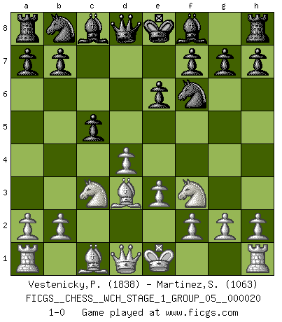 Last move : 1-0 2018 December 10 0:55:57 [Event "FICGS__CHESS__WCH_STAGE_1_GROUP_05__000020"] [Site "FICGS"] [Date "2018.11.01"] [Round "1"] [White "Vestenicky,Patrik"] [Black "Martinez,Silvio"] [Result "1-0"] [WhiteElo "1838"] [BlackElo "1063"] 1.d4 d5 2.c4 c5 3.cxd5 Qxd5 4.e3 Nf6 5.Nc3 Qd8 6.Nf3 e6 7.Bd3 1-0 This chess game has been lost on time (started : 2018.11.01 15:27:35) QGD : Symmetrical (Austrian) defense Player White won this chess game. Follow this game move after move (download)If your opponent offers you a draw, try to work out why he thinks he's worse off. (Nigel Short) Als er Schachweltmeister wurde ließ er praktisch alle stärksten Sovietspieler für sich arbeiten. Wenn ein auch nur mittelmässiger Meister ein Spezialist für eine bestimmte Eröffnung war, wurde er von Karpov gerufen. Das wurde alles geheim gehalten. (Mikhail Moiseyevich Botvinik) El hombre es un frívolo, una creatura engañosa y como un jugador de Ajedrez, se preocupa mas por el proceso de obtener su meta que de la meta por sí misma. (Dostoyevsky) La menace est plus forte que l'exécution. (Aaron Nimzovitch) Establishing goals is all right if you don't let them deprive you of interesting detours. (Doug Larson)
