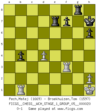 Last move : 0-1 2019 April 28 22:24:41 [Event "FICGS__CHESS__WCH_STAGE_1_GROUP_05__000020"] [Site "FICGS"] [Date "2018.11.01"] [Round "1"] [White "Pech,Matej"] [Black "Broekhuizen,Tom"] [Result "0-1"] [WhiteElo "1669"] [BlackElo "1597"] 1.d4 Nf6 2.c4 e6 3.Nc3 Bb4 4.e3 O-O 5.Bd3 d5 6.Nf3 dxc4 7.Bxc4 c5 8.O-O cxd4 9.exd4 b6 10.Bg5 h6 11.Bh4 Bb7 12.a3 Bxc3 13.bxc3 Nc6 14.Bd3 Ne7 15.Bxf6 gxf6 16.Qd2 Kg7 17.Nh4 Qd5 18.f4 f5 19.Be2 Qd6 20.a4 Rac8 21.a5 Rc7 22.c4 b5 23.cxb5 Rfc8 24.Bf3 Rc2 25.Qe3 Bxf3 26.Nxf3 Qd7 27.b6 Nd5 28.Qb3 Qb7 29.Ne1 R2c3 30.Qb2 axb6 31.a6 Qc7 32.g3 Qa7 33.Qb5 R3c4 34.g4 Rb4 35.Qe2 b5 36.Qe5+ Kh7 37.gxf5 Rg8+ 38.Kh1 Ra4 39.Nf3 Rxa6 40.Rae1 Qb7 41.fxe6 Rxe6 42.Qf5+ Reg6 43.Qd3 Kh8 44.Ne5 Rf6 45.f5 Rb6 46.Qe4 Nf6 47.Qxb7 Rxb7 48.Rb1 b4 49.Nc6 Nd5 50.f6 Kh7 51.Rf3 Nc3 52.Re1 Nd5 53.Rb1 Rc7 54.Ne7 Nxe7 55.fxe7 Rxe7 0-1 Tom Broekhuizen You are a hard player to beat, Mr. Mataj. Nimzo-Indian : 4.e3 O-O, 5.Bd3 d5 Kingside Castling by player Black (move 4) Kingside Castling by player White (move 8) Player Black won this chess game. Follow this game move after move (download)On the chessboard, lies and hypocrisy do not survive long. (Emanuel Lasker) Stelle das Brett so, daß die Sonne in die Augen deines Gegners scheint. (Ruy López) El estómago es una parte esencial del maestro de Ajedrez. (Bent Larsen) Le joueur d'Echecs qui veut atteindre le top est obligé de développer son propre credo créatif. Alexeï Stepanovicth Souétine. Il est facile d'écrire des livres ! Ce qui est difficile, c'est de jouer ! (Alexeï Stepanovicth Souétine) SEO proverb : Make your website optimized for human beings, not for search engines.