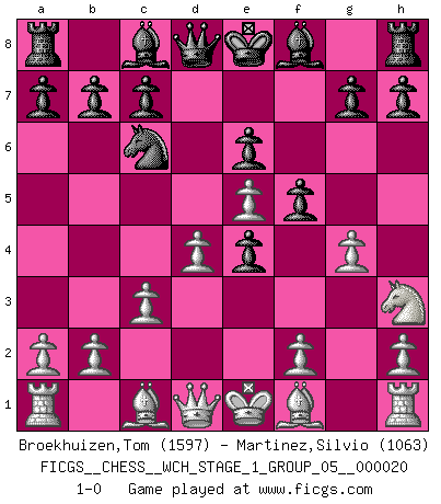 Last move : 1-0 2018 December 15 13:58:22 [Event "FICGS__CHESS__WCH_STAGE_1_GROUP_05__000020"] [Site "FICGS"] [Date "2018.11.01"] [Round "1"] [White "Broekhuizen,Tom"] [Black "Martinez,Silvio"] [Result "1-0"] [WhiteElo "1597"] [BlackElo "1063"] 1.e4 Nc6 2.d4 d5 3.Nc3 Nf6 4.e5 Ne4 5.Nxe4 dxe4 6.c3 f5 7.Nh3 e6 8.g4 1-0 This chess game has been lost on time (started : 2018.11.01 15:27:35) KP : Nimzovich defense, Bogolyubov variation Player White won this chess game. Follow this game move after move (download)Life is like a game of Chess, changing with each move. (Chinese proverb) Schach ist eine Sache der genauen Beurteilung, wann man zuschlagen und wann man sich ducken muss. (Robert James Fischer) Fischer es una tragedia del Ajedrez Americano a la par con Morphy y Pillsbury. (Mig Greengard) Les échecs sont un jeu terrible. Si vous n'avez pas le centre, votre adversaire a une position plus libre. Par contre, si vous avez le centre, alors vous avez vraiment quelque chose pour laquelle vous inquiéter ! (Siegbert Tarrasch) God is an atheist. (Unknown)