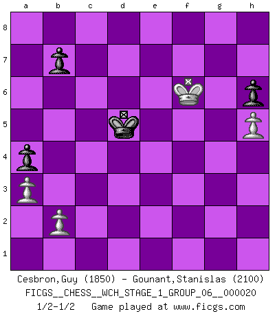 Last move : 1/2-1/2 2019 January 18 1:33:0 [Event "FICGS__CHESS__WCH_STAGE_1_GROUP_06__000020"] [Site "FICGS"] [Date "2018.11.01"] [Round "1"] [White "Cesbron,Guy"] [Black "Gounant,Stanislas"] [Result "1/2-1/2"] [WhiteElo "1850"] [BlackElo "2100"] 1.e4 c6 2.d4 d5 3.Nd2 dxe4 4.Nxe4 Bf5 5.Ng3 Bg6 6.h4 h6 7.Nf3 Nd7 8.h5 Bh7 9.Bd3 Bxd3 10.Qxd3 e6 11.Bd2 Ngf6 12.O-O-O Be7 13.Ne4 Nxe4 14.Qxe4 Nf6 15.Qe2 Qd5 16.c4 Qe4 17.Qxe4 Nxe4 18.Be3 f5 19.Kc2 f4 20.Kd3 fxe3 21.Kxe4 exf2 22.Rdf1 O-O-O 23.Rxf2 Rhf8 24.Rhf1 c5 25.dxc5 Bxc5 26.Rd2 Rf6 27.Rxd8+ Kxd8 28.a3 a5 29.Rd1+ Kc8 30.g4 g5 31.hxg6 Rxg6 32.Ne5 Rg5 33.Rh1 Bd6 34.Rh5 Rxh5 35.gxh5 a4 36.Ng4 Bf8 37.Ke5 Bg7+ 38.Nf6 Bxf6+ 39.Kxf6 Kd7 40.c5 Kc6 41.Kxe6 Kxc5 42.Kf6 Kd5 1/2-1/2 Caro-Kann : 3.Nd2 Queenside Castling by player White (move 12) Queenside Castling by player Black (move 22) 10 pieces endgame at move 39 : White KPPPP , Black KPPPP WHITE : King + 4 Pawns BLACK : King + 4 Pawns 9 pieces endgame at move 41 : White KPPPP , Black KPPP WHITE : King + 4 Pawns BLACK : King + 3 Pawns 8 pieces endgame at move 41 : White KPPP , Black KPPP WHITE : King + 3 Pawns BLACK : King + 3 Pawns This chess game ended in a draw. Follow this game move after move (download)Via the squares on the chessboard, the Indians explain the movement of time and the age, the higher influences which control the world and the ties which link Chess with the human soul. (Al-Masudi) Ich hatte Zahnschmerzen im ersten Spiel. In der zweiten Partie tat mir der Kopf weh. In der dritten war es eine Rheuma-Attacke und während der vierten fühlte ich mich nicht gut. Und in der fünften? Nun, man muss doch nicht jedes Spiel gewinnen, oder? (Savielly Grigorievitsch Tartakower) Cuando me preguntan: -¿Cual es el secreto que te hace hacer mejores movidas que tus oponentes?, Yo respondo: Me da gusto que me pregunten eso, porque, como veran, hay una simple razón. Yo pienso mis propias movidas y dejo a mi oponente que el piense las suyas. (Alexander Alekhine) Les sacrifices démontrent seulement que quelqu'un a gaffé. (Savielly Tartacover) Lamb in skin of tiger, still fears the wolf. (Chinese proverb)