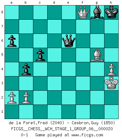 Last move : 0-1 2019 March 12 13:36:22 [Event "FICGS__CHESS__WCH_STAGE_1_GROUP_06__000020"] [Site "FICGS"] [Date "2018.11.01"] [Round "1"] [White "de la Foret,Fred"] [Black "Cesbron,Guy"] [Result "0-1"] [WhiteElo "2040"] [BlackElo "1850"] 1.d4 d5 2.c4 c6 3.Nf3 Nf6 4.e3 e6 5.Nc3 Nbd7 6.Qc2 Bd6 7.Be2 dxc4 8.Bxc4 b5 9.Be2 Bb7 10.O-O O-O 11.Bd2 a6 12.e4 e5 13.dxe5 Nxe5 14.Rad1 Qc7 15.Nxe5 Bxe5 16.f4 Bd4+ 17.Kh1 c5 18.e5 Bxc3 19.Bxc3 Nd5 20.Rd3 Rad8 21.Rh3 g6 22.f5 b4 23.Bd2 Qxe5 24.Bd3 Rfe8 25.Rg3 Rd6 26.Rgf3 Rd7 27.Rg3 Rd6 28.fxg6 hxg6 29.Rg5 Qe6 30.Rg3 Qe5 31.Bxg6 Rxg6 32.Rxg6+ fxg6 33.Qxg6+ Kh8 34.Qh6+ Kg8 35.Qg6+ Kh8 36.h4 Nf6 37.Rxf6 Bxg2+ 38.Kg1 Be4 39.Qh6+ Bh7 40.Rf8+ Rxf8 41.Qxf8+ Bg8 42.Bg5 Qe1+ 43.Kg2 Qe2+ 44.Kh3 Qe6+ 0-1 QGD Slav : 4.e3 Kingside Castling by player White (move 10) Kingside Castling by player Black (move 10) Player Black won this chess game. Follow this game move after move (download)All I want to do, ever, is just play Chess. (Bobby Fischer) Es ist schade, dass viele Schachsportler vergessen, wie wichtig Auftreten und angemessene Kleidung sind. (Alexandra Kosteniuk) El Ajedrez es el arte del análisis. (Mikhail Botvinnik) On a dit que l'homme se distingue de l'animal par le fait qu'il achète plus de livres qu'il ne peut en lire. Je voudrais suggérer qu'inclure à la liste des livres quelques livres d'échecs rendrait la distinction manifeste. (Edward Lasker) Who needs drugs and alcohol if he can play Big Chess at FICGS ? (Heinz-Georg Lehnhoff)
