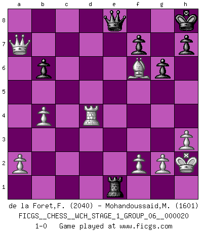 Last move : 1-0 2019 February 20 20:57:9 [Event "FICGS__CHESS__WCH_STAGE_1_GROUP_06__000020"] [Site "FICGS"] [Date "2018.11.01"] [Round "1"] [White "de la Foret,Fred"] [Black "Mohandoussaid,Malik"] [Result "1-0"] [WhiteElo "2040"] [BlackElo "1601"] 1.d4 d5 2.c4 c6 3.Nf3 Nf6 4.Nc3 g6 5.e3 Bg7 6.Bd3 O-O 7.O-O Bg4 8.h3 Bxf3 9.Qxf3 e6 10.Bd2 Nbd7 11.b4 b6 12.Rac1 Rc8 13.Rfd1 Qe7 14.cxd5 cxd5 15.Rc2 e5 16.Nxd5 Nxd5 17.Rxc8 Rxc8 18.Qxd5 Kh8 19.Qb7 Qd8 20.Qxa7 exd4 21.exd4 Bxd4 22.Bf4 Nf6 23.Be2 Rc2 24.Be5 Rxe2 25.Rxd4 Re1+ 26.Kh2 Qe8 27.Bxf6+ 1-0 This chess game has been lost on time (started : 2018.11.01 15:27:37) QGD Slav : Schlechter variation Kingside Castling by player Black (move 6) Kingside Castling by player White (move 7) Player White won this chess game. Follow this game move after move (download)I won't play with you anymore. You have insulted my friend. - When an opponent cursed himself for a blunder. (Miguel Najdorf) Ich bin es gewohnt, das die Jugend mir überhaupt keinen Respekt entgegenbringt. (Alexander Morozewich) El tablero es el mundo, las piezas es el fenomeno del universo, las reglas del juego son lo que llamamos leyes de la naturaleza y el jugador del lado opuesto, se encuentra oculto a nuestra vista. (Thomas Huxley) Echiquier : carré parfait, comme la Jérusalem nouvelle décrite par l'auteur de l'Apocalypse, huit cases sur huit, exaltation du chiffre 4, symbole du cosmos aux quatre horizons... où le noir et le blanc, l'ombre et la lumière, le mal et le bien s'entremêlent et se conjuguent. (Robert Couffignal, Le Gambit du poète) 'preceded by its own quotation yields a falsehood' preceded by its own quotation yields a falsehood. (W. V. O. Quine - Set Theory And Its Logic, 1953)