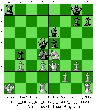 Last move : 0-1 2019 January 1 23:34:44 [Event "FICGS__CHESS__WCH_STAGE_1_GROUP_06__000020"] [Site "FICGS"] [Date "2018.11.01"] [Round "1"] [White "Csoma,Robert"] [Black "Brotherton,Trevor"] [Result "0-1"] [WhiteElo "1640"] [BlackElo "1905"] 1.Nf3 f5 2.d3 Nc6 3.e4 e5 4.Bg5 Be7 5.Bxe7 Ngxe7 6.Nc3 O-O 7.Be2 d6 8.Qd2 Ng6 9.O-O-O Nf4 10.g3 Nxe2+ 11.Qxe2 fxe4 12.Nd2 exd3 13.cxd3 Bf5 14.Nde4 d5 15.Nc5 Qd6 16.Nb3 a5 17.Nb5 Qb4 18.Nxc7 Rfc8 19.Nxd5 Qd6 20.Nc3 a4 21.Na1 Nd4 22.Qd2 b5 23.Kb1 b4 24.Ne4 Qd5 25.Qe3 Be6 26.b3 axb3 27.axb3 Rxa1+ 28.Kxa1 Ra8+ 0-1 Reti v Dutch Kingside Castling by player Black (move 6) Queenside Castling by player White (move 9) Player Black won this chess game. Follow this game move after move (download)Chess is a terrific way for kids to build self image and self esteem. (Saudin Robovic) Stelle das Brett so, daß die Sonne in die Augen deines Gegners scheint. (Ruy López) En la perfecta combinación de Ajedrez como en una historia corta de primera clase, toda la trama y contra trama deberá conducir hacia un final sorprendente, el interes no es mitigado hasta el último momento. (Yates and Winter) Ce qui est bien, c'est d'avoir tout un tas de pièces en prise : l'adversaire ne peut en prendre qu'une à la fois. Cité par Thierry Audin. Don't anthropomorphize computers - they hate it. (Anonymous)