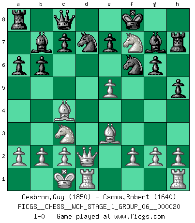 Last move : 1-0 2018 December 1 9:2:34 [Event "FICGS__CHESS__WCH_STAGE_1_GROUP_06__000020"] [Site "FICGS"] [Date "2018.11.01"] [Round "1"] [White "Cesbron,Guy"] [Black "Csoma,Robert"] [Result "1-0"] [WhiteElo "1850"] [BlackElo "1640"] 1.e4 d6 2.d4 Nf6 3.Nc3 g6 4.Be3 Bg7 5.Qd2 h5 6.O-O-O b6 7.Nf3 Bb7 8.Bb5+ Kf8 9.Ng5 a6 10.Bd3 Nbd7 11.e5 dxe5 12.Bc4 Qc8 13.Nxf7 Rh7 14.dxe5 1-0 Pirc defense Queenside Castling by player White (move 6) Player White won this chess game. Follow this game move after move (download)Half the variations which are calculated in a tournament game turn out to be completely superfluous. Unfortunately, no one knows in advance which half. (Jan Tinman) Eine Person mit durchschnittlichem IQ kann etwa eine ELO von 2000 erreichen. (Jonathan Levitt) No es suficiente ser un buen jugador, se debe también de jugar bién. (Siegbert Tarrasch) Pour moi, les échecs ne sont pas un jeu mais un art. (Alexandre Alekhine) There are two types of people in this world, good and bad. The good sleep better, but the bad seem to enjoy the waking hours much more. (Woody Allen)