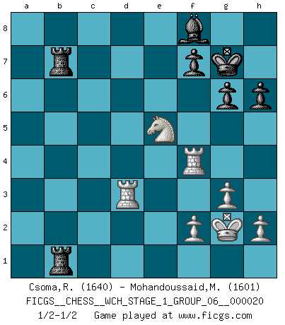Last move : 1/2-1/2 2019 February 1 23:13:5 [Event "FICGS__CHESS__WCH_STAGE_1_GROUP_06__000020"] [Site "FICGS"] [Date "2018.11.01"] [Round "1"] [White "Csoma,Robert"] [Black "Mohandoussaid,Malik"] [Result "1/2-1/2"] [WhiteElo "1640"] [BlackElo "1601"] 1.Nf3 Nf6 2.d4 d5 3.c4 c6 4.Nc3 g6 5.e3 Bg7 6.Be2 O-O 7.O-O Bf5 8.Qb3 b6 9.Bd2 e6 10.Rac1 Nbd7 11.cxd5 exd5 12.Na4 Rc8 13.Bd3 Bxd3 14.Qxd3 Re8 15.Rc2 c5 16.dxc5 Nxc5 17.Nxc5 bxc5 18.Qa6 Qb6 19.Qxb6 axb6 20.a4 Ne4 21.Ra1 d4 22.exd4 cxd4 23.Rac1 Rcd8 24.Rc6 Nxd2 25.Nxd2 Re2 26.Nc4 d3 27.Rd1 d2 28.Kf1 Rde8 29.Nxd2 Bxb2 30.Rc4 Ba3 31.Nb3 Rb2 32.Nc1 b5 33.axb5 Rxb5 34.Ne2 Rb2 35.Ng3 Bf8 36.Ne4 Kg7 37.g3 Ra8 38.Ng5 R8a2 39.Rf4 Rb7 40.Rd3 Ra1+ 41.Kg2 h6 42.Nf3 Rab1 43.Ne5 1/2-1/2 Reti Opening Kingside Castling by player Black (move 6) Kingside Castling by player White (move 7) This chess game ended in a draw. Follow this game move after move (download)To avoid losing a piece, many a person has lost the game. (Savielly Tartakover) Wer wird heute Abend ihr Gegner sein? -- Heute Abend spiele ich gegen die schwarzen Steine. (Akiba Rubinstein) El Ajedrez es como la guerra en un tablero. (Bobby Fischer) Il n'y a plus de joueurs du niveau de Jacob Murray dont la seule quête est le beau jeu, le plaisir de voir les pièces construire quelque chose. Sur 10 idées à la minute, 9 seront sans intérêt, la dernière s'avèrera géniale. (Christian Bauer) Any activity becomes creative when the doer cares about doing it right or doing it better. (John Updike)