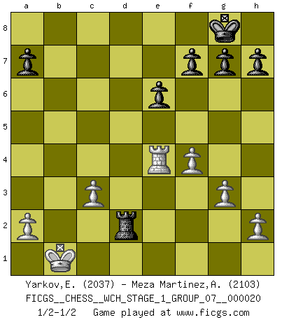 Last move : 1/2-1/2 2019 January 14 17:24:13 [Event "FICGS__CHESS__WCH_STAGE_1_GROUP_07__000020"] [Site "FICGS"] [Date "2018.11.01"] [Round "1"] [White "Yarkov,Evgeny"] [Black "Meza Martinez,Alcides Ivan"] [Result "1/2-1/2"] [WhiteElo "2037"] [BlackElo "2103"] 1.e4 e6 2.d4 d5 3.Nc3 dxe4 4.Nxe4 Nd7 5.Nf3 Ngf6 6.Nxf6+ Nxf6 7.Bd3 c5 8.Be3 Qc7 9.Qe2 Be7 10.O-O-O Bd7 11.dxc5 Bxc5 12.Bxc5 Qxc5 13.Ne5 Bc6 14.Rhe1 O-O 15.f4 Rac8 16.Kb1 Nd5 17.g3 Qb6 18.Ka1 Nb4 19.Nxc6 Qxc6 20.c3 Nxd3 21.Rxd3 Rcd8 22.Red1 Rxd3 23.Rxd3 b5 24.Rd4 b4 25.Qe4 Qxe4 26.Rxe4 Rd8 27.Kb1 bxc3 28.bxc3 Rd2 1/2-1/2 French : Rubinstein variation Queenside Castling by player White (move 10) Kingside Castling by player Black (move 14) This chess game ended in a draw. Follow this game move after move (download)What would Chess be without silly mistakes ? (Kurt Richter) Die Jungen erwarten, dass Opa einfach umfällt. Dann aber kann Opa fünf Stunden lang Schach spielen und die jungen Gegner an die Wand drücken. (Viktor Kortschnoi) Estaba muy claro de que el punto vulnerable del Gran Maestro Americano (Bobby Fischer) radicaba en las posiciones de doble filo, colgantes, irracionales, donde el siempre falló en encontrar un triunfo aún en una posición de clara victoria. (Efim Geller) A ce moment-là, je menaçais de comprendre la position ! (Clément L'Heureux) Experiences are the keys to life. (Daniel Parmet)