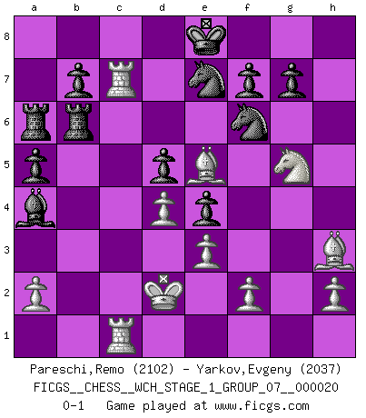 Last move : 0-1 2019 February 8 19:36:38 [Event "FICGS__CHESS__WCH_STAGE_1_GROUP_07__000020"] [Site "FICGS"] [Date "2018.11.01"] [Round "1"] [White "Pareschi,Remo"] [Black "Yarkov,Evgeny"] [Result "0-1"] [WhiteElo "2102"] [BlackElo "2037"] 1.d4 d5 2.c4 c6 3.Nf3 Nf6 4.Nc3 e6 5.e3 Nbd7 6.Qc2 Bd6 7.g4 h6 8.Rg1 e5 9.cxd5 cxd5 10.Nb5 Bb8 11.g5 hxg5 12.Nxg5 e4 13.Bd2 Nb6 14.Rc1 Bd7 15.Qc5 Bc6 16.Bb4 Nc8 17.Bh3 Ne7 18.Nd6+ Bxd6 19.Qxd6 Qxd6 20.Bxd6 Nfg8 21.b4 Rh6 22.Bf4 a5 23.b5 Bxb5 24.Rc7 Rb6 25.Kd2 Ba4 26.Rgc1 Nf6 27.Be5 R8a6 0-1 This chess game has been lost on time (started : 2018.11.01 15:27:39) QGD Slav : 4.Nc3 Player Black won this chess game. Follow this game move after move (download)Alekhine is a poet who creates a work of art out of something that would hardly inspire another man to send home a picture post card. (Max Euwe) Ich glaube, ich kenne inzwischen die Gründe für mein Versagen: schachliche Charakterfehler. Ich war nie ein Wunderkind und in meiner gesamten menschlichen Entwicklung immer zu langsam. (Viktor Kortschnoi) Si el ingenio solamente fuese necesario para lucirse, las mujeres serían las mejores jugadoras de Ajedrez del mundo. (Albin) Le profane ne songe pas à la somme de jouissance dont il se prive, qui méconnaît ce jeu aux ressources aussi variées que passionnantes. (Jean-Marie Jeanton-Lamarche) A belief is an idea the mind possesses, an idea that possesses the mind. (Robert Oxden Bolton)