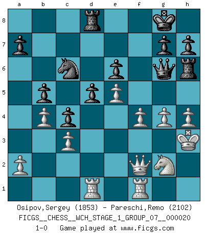 Last move : 1-0 2019 January 15 17:56:3 [Event "FICGS__CHESS__WCH_STAGE_1_GROUP_07__000020"] [Site "FICGS"] [Date "2018.11.01"] [Round "1"] [White "Osipov,Sergey"] [Black "Pareschi,Remo"] [Result "1-0"] [WhiteElo "1853"] [BlackElo "2102"] 1.d4 e6 2.e4 d5 3.Nd2 Nf6 4.e5 Nfd7 5.Bd3 c5 6.c3 b6 7.Ne2 Ba6 8.Bxa6 Nxa6 9.O-O Be7 10.Ng3 O-O 11.Qg4 f5 12.exf6 Rxf6 13.Nh5 Rg6 14.Qe2 Nc7 15.Nf3 Bd6 16.Ne5 Bxe5 17.dxe5 c4 18.g3 Nc5 19.h3 Rc8 20.Kh2 Nd3 21.Nf4 Nxc1 22.Raxc1 Rh6 23.Ng2 Na6 24.b4 Nb8 25.f4 Qe8 26.g4 b5 27.Rcd1 Rd8 28.h4 Nc6 29.Kh3 Qg6 30.Qf2 1-0 Queen's pawn Kingside Castling by player White (move 9) Kingside Castling by player Black (move 10) Player White won this chess game. Follow this game move after move (download)A sacrifice is best refuted by accepting it. (Wilhelm Steinitz) Modernes Schach sorgt sich zuviel um Dinge wie Bauernstruktur usw. Vergessen Sie das, Schachmatt beendet das Spiel! (Nigel Short) Después de la respuesta de las negras a 1.e4 con 1..e5, se quedan siempre tratando de entrar dentro del juego. (Howard Staunton) Ce qui est bien, c'est d'avoir tout un tas de pièces en prise : l'adversaire ne peut en prendre qu'une à la fois. Cité par Thierry Audin. Man is still the most extraordinary computer of all. (John F. Kennedy)