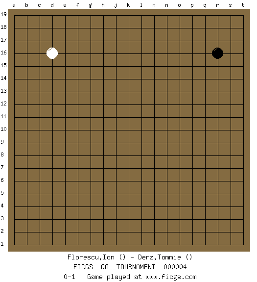 Last move : 0-1 2006 August 6 15:59:13 [Event "FICGS__GO__TOURNAMENT__000004"] [Site "FICGS"] [Date "2006.06.08"] [Round "1"] [Black "Florescu,Ion"] [White "Derz,Tommie"] [Result "0-1"] 1.r16 d16 0-1 This go game has been lost on time (started : 2006.06.08 14:53:11) Here are the names of the openings (joseki) played in the four corners : Player White won this Go (weiqi, baduk) game. Follow this game move after move (download)In an unreasonable situation, an unreasonable move is reasonable. (Tamino) Information on the Internet is subject to the same rules and regulations as conversation at a bar. (George Lundberg)